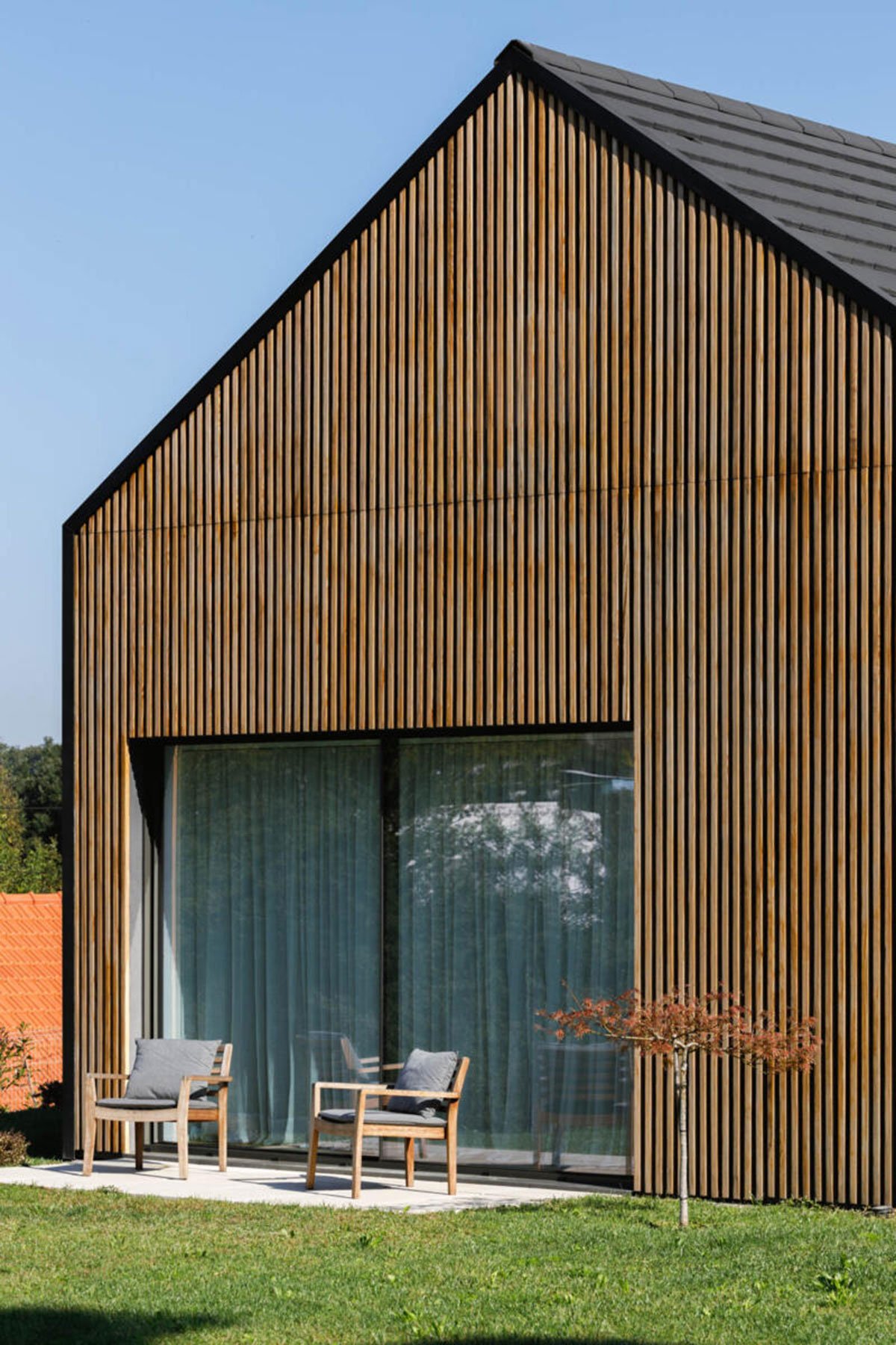 Due to the simplicity and relevance of its interior design, with light, minimalist and smooth walls, it offers a peaceful living space. In contrast to the dark exterior, where the black plant tile and the pine together with the simple shape of the building create a striking graphic silhouette against the landscape. On the whole, through the juxtaposition of its facade materials, we get closer to the natural, the beautiful, where we hope that its inhabitants are happy.