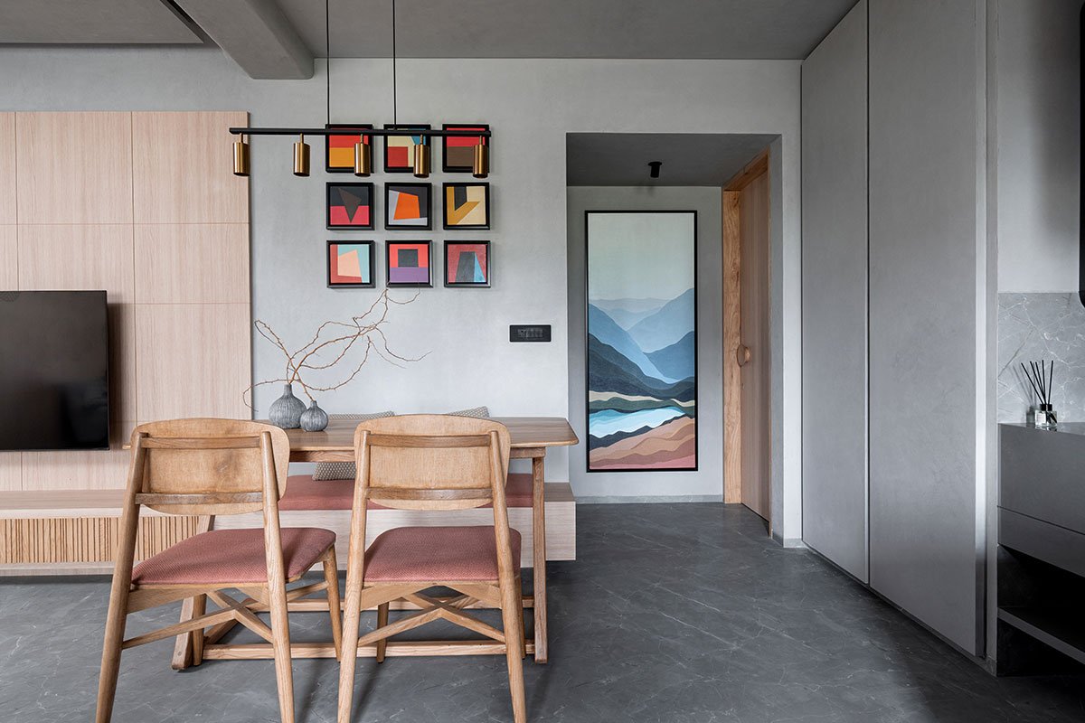 The advocated minimalism is profoundly executed, where the delicate selection of laminates, tiles and shades plays a pivotal role in fostering a homogenous zen atmosphere. The organic continuation of the mood board, bids to keep the interiors light and voluminous, subtly interspersed with hints of vivid colours through wall art, elegantly mirrors the client’s ethos for a simplistic yet harmonic design approach.
