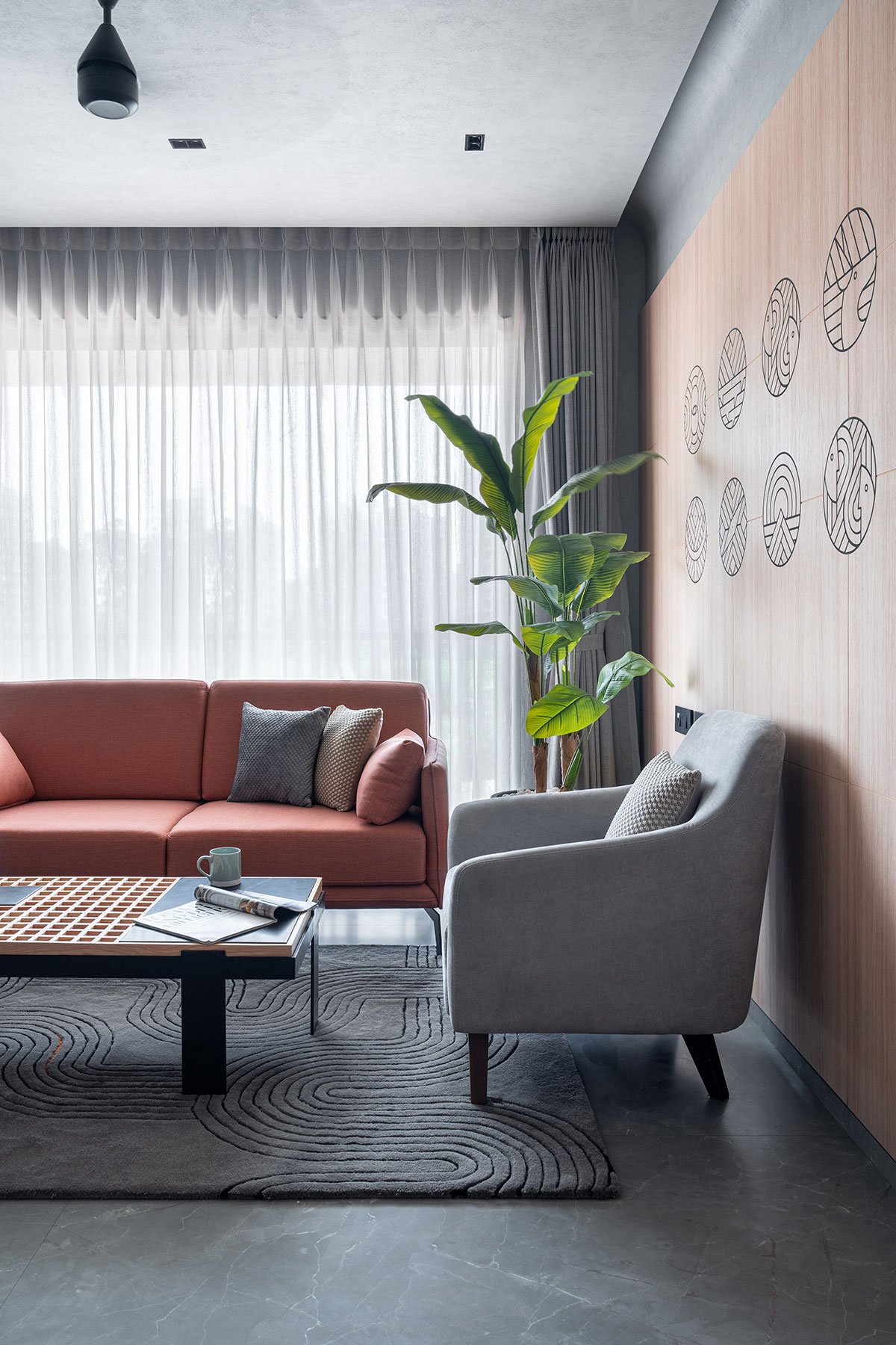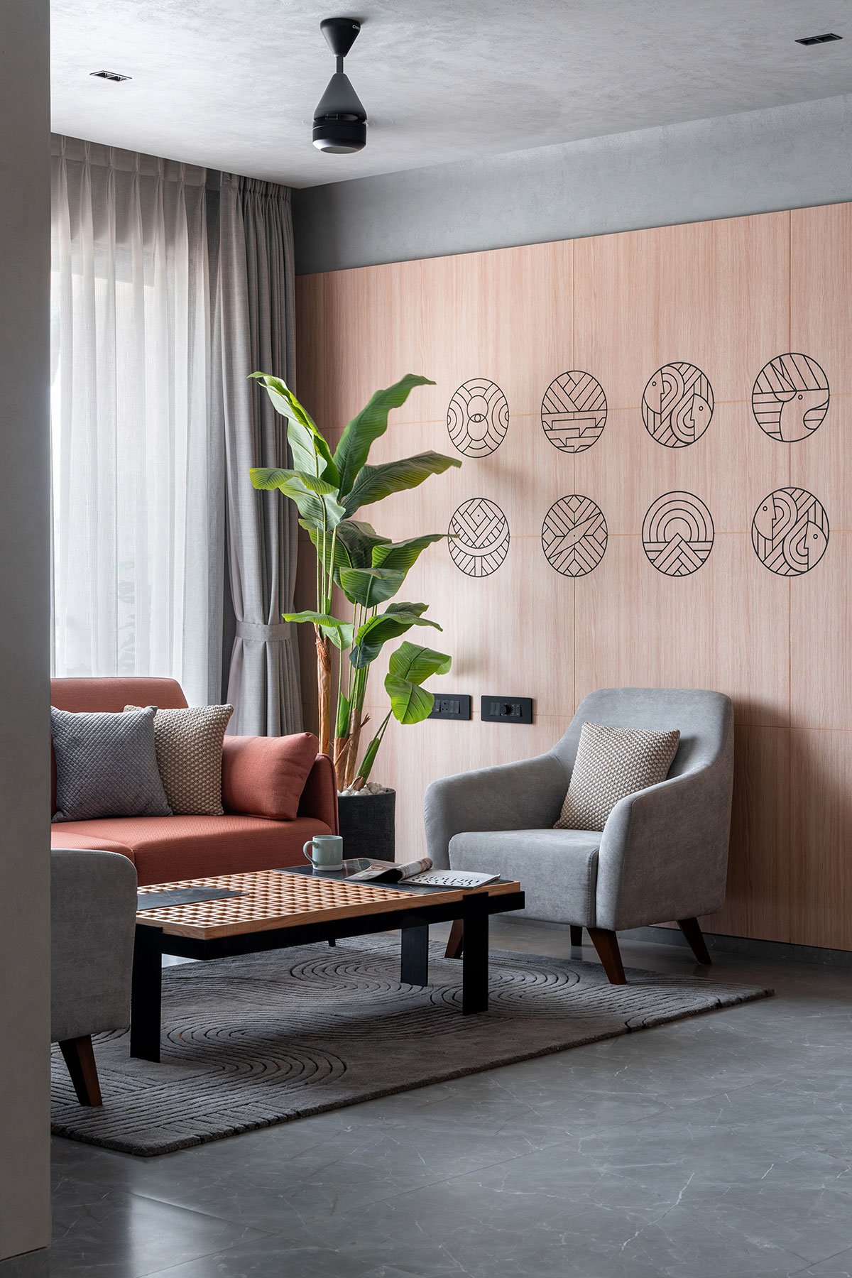 To breathe life into this monochromatic canvas, indoor plants bring a sense of depth and vibrancy, while the introduction of texture, in the form of floor rugs, intricate wall patterns and laminated wall panelling, adds a modern and dynamic twist. Custom-tailored wall art subtly infuses character and depth, incorporating natural tones and wooden laminates that exude warmth and comfort. Notably, the wooden laminated wall with its unique artistry serves as a central focal point, while the customized centre table, marrying form and function, exemplifies the meticulous attention to detail that defines the space.