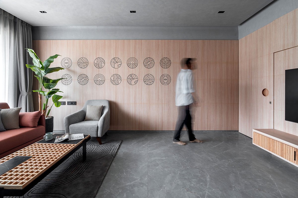 Warmly welcoming one into the tranquil setting, a large wooden door unfolds into a Zen living room. Staged so still, the exquisite wooden wall oomph the mono toned backdrop. The living area, a serene masterpiece showcases how the ‘grey’ elegantly employed on finely grained Italian flooring, resonates seamlessly through the crisp ceilings and the furnishings, gently blended with pastel accents to create an ambiance that is both tranquil and inviting.