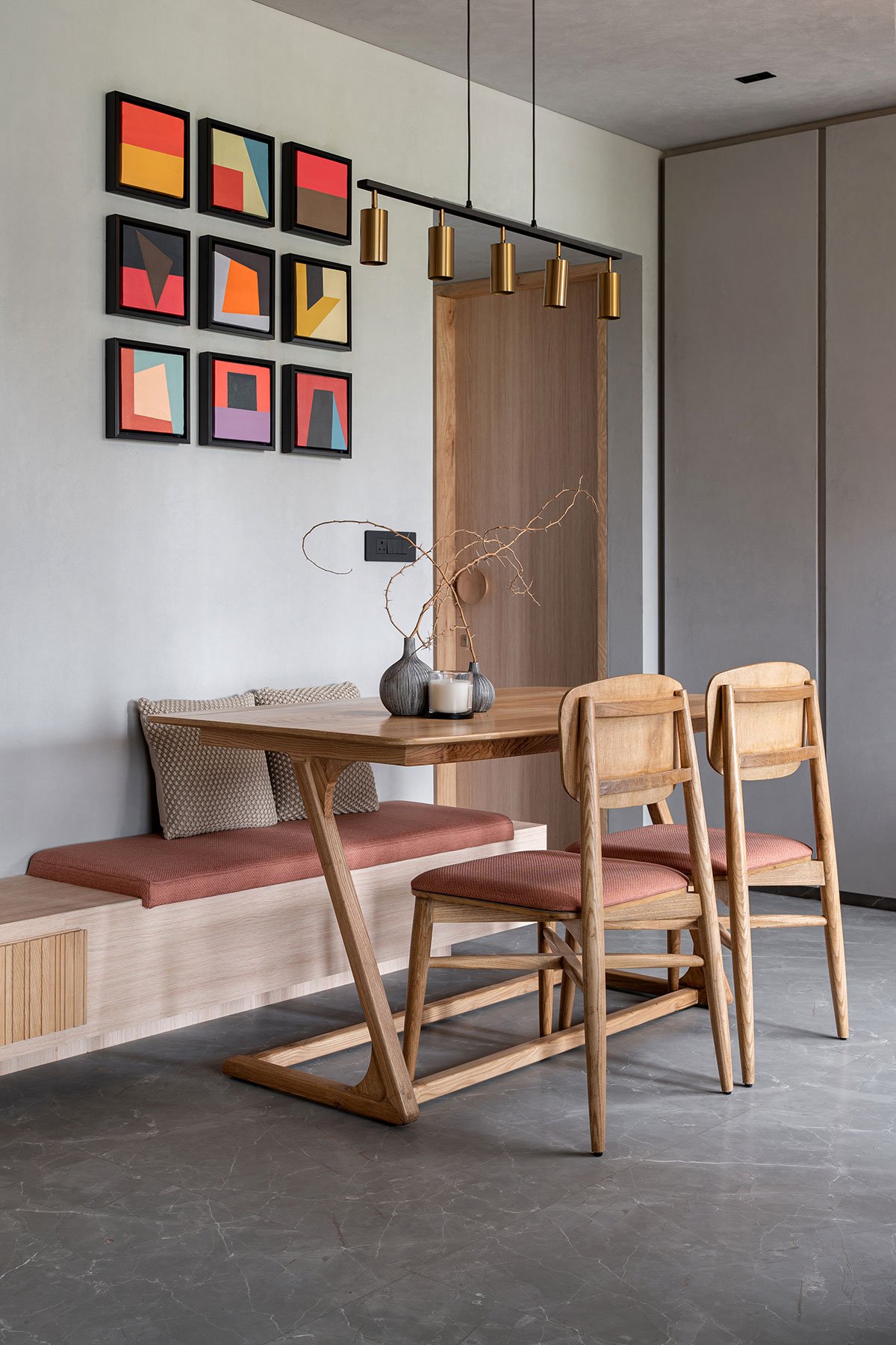 The dining area, an elegant extension of the living, maintains the same language while introducing subtle accents of brass that redefine the charisma of the space. In a space conscious approach, an innovative dining setup takes centre stage, embracing multi- functionality without compromising the style. The introduction of vibrant art décor with gracefully suspended brass lights adds character and comfort, creating an experiential gaze.