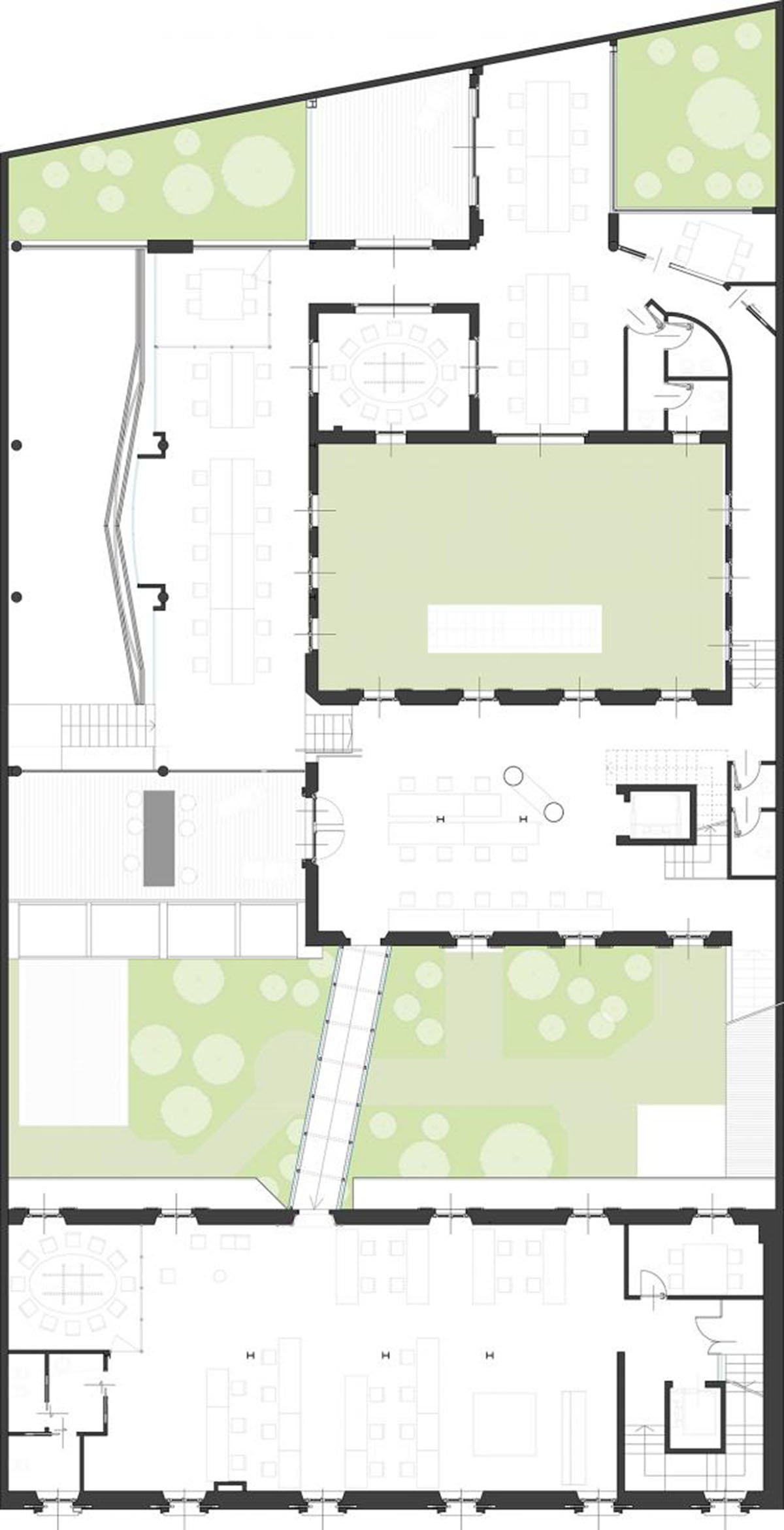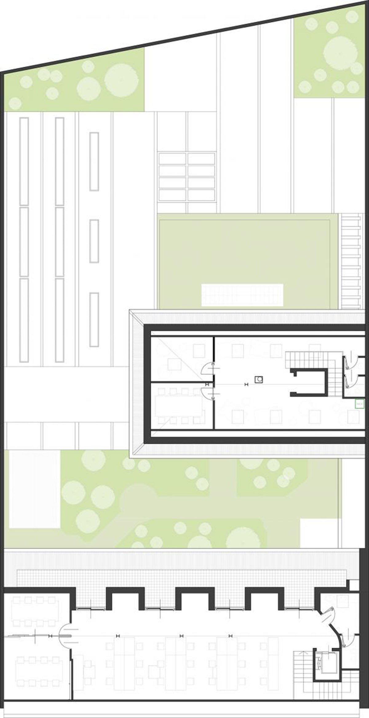 The complete urban block is very articulated with courtyards and different separated working areas that are connected one to another with specific paths. Moreover, Offices tend to bring residential features inside the working environment since we think this principle as the new way of designing and thinking offices.