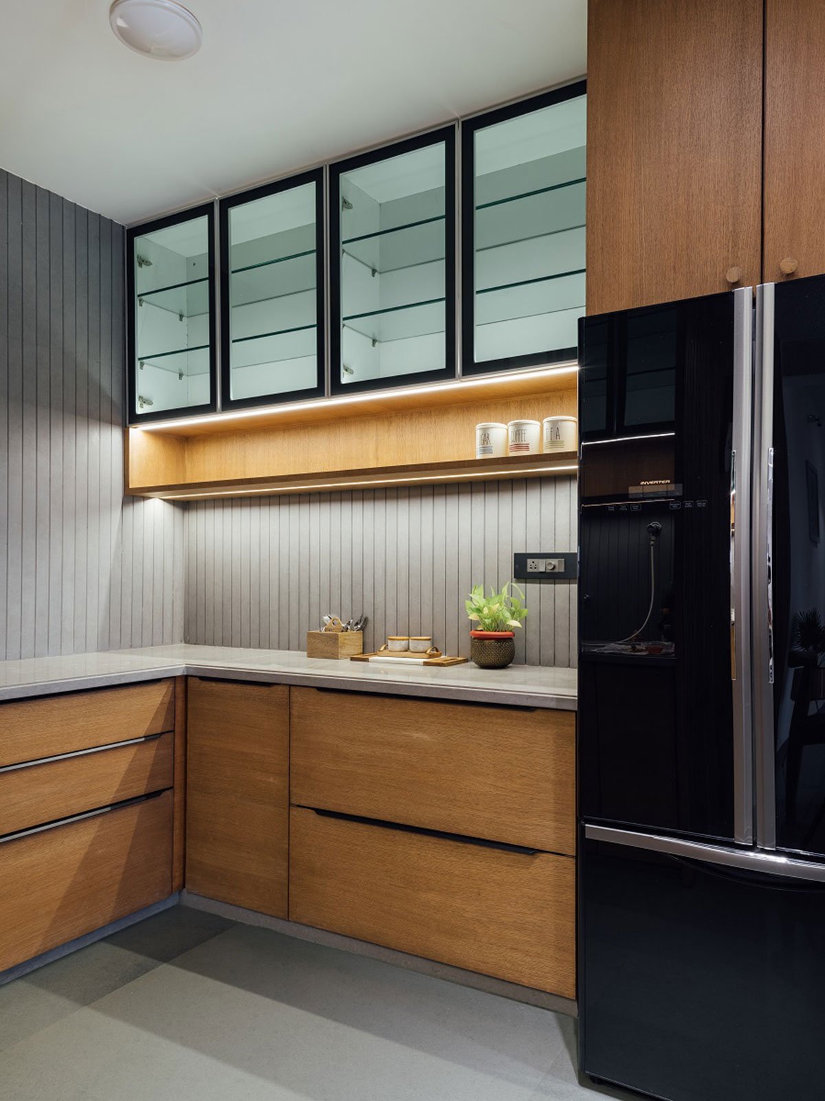 The dining & open kitchen section witness the coming together of warm wood tones & doses of stark black. The main dining accent wall with vertical teak grooves gives the space a textural quality that is seen & felt. This feature goes on to become a staple across the house, giving the design a cohesive feel.