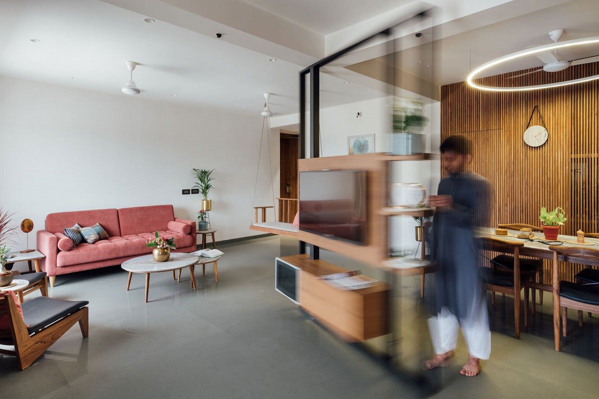 An open living area, dining section & family lounge function as one mammoth spatial volume in which the family members can gather & entertain in. Blush tones in the form of high-end upholstery grace the living room & create contrast against the cool grey of the Kota stone flooring across the house. The modern statement swing is just that ideal piece of furniture that is characteristic of Indian homes & makes the space interactive.