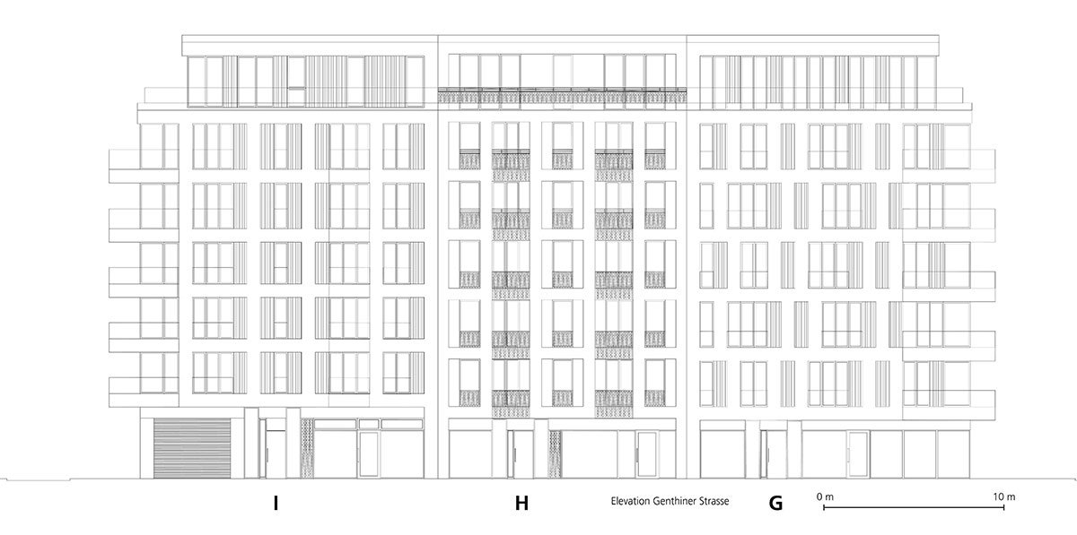 [Text as submitted by architect] The newly created residential ensemble on Kurfuerstenstrasse and Genthiner Strasse blends harmoniously into the lively district in the direct vicinity of City West. Concisely described in the project name as the interface between the Schoeneberg and Tiergarten districts, the building project on a plot of land measuring almost 7,200 square metres closes the existing perimeter block development and thus a gap that has existed for decades. The naturally grown city block will be redefined with the new project in the tradition of the European City. Nollendorfplatz can be reached on foot from here, and the Kurfuerstendamm shopping mile is just a short underground train ride away. A good connection also makes it easy to reach other destinations throughout Berlin.
