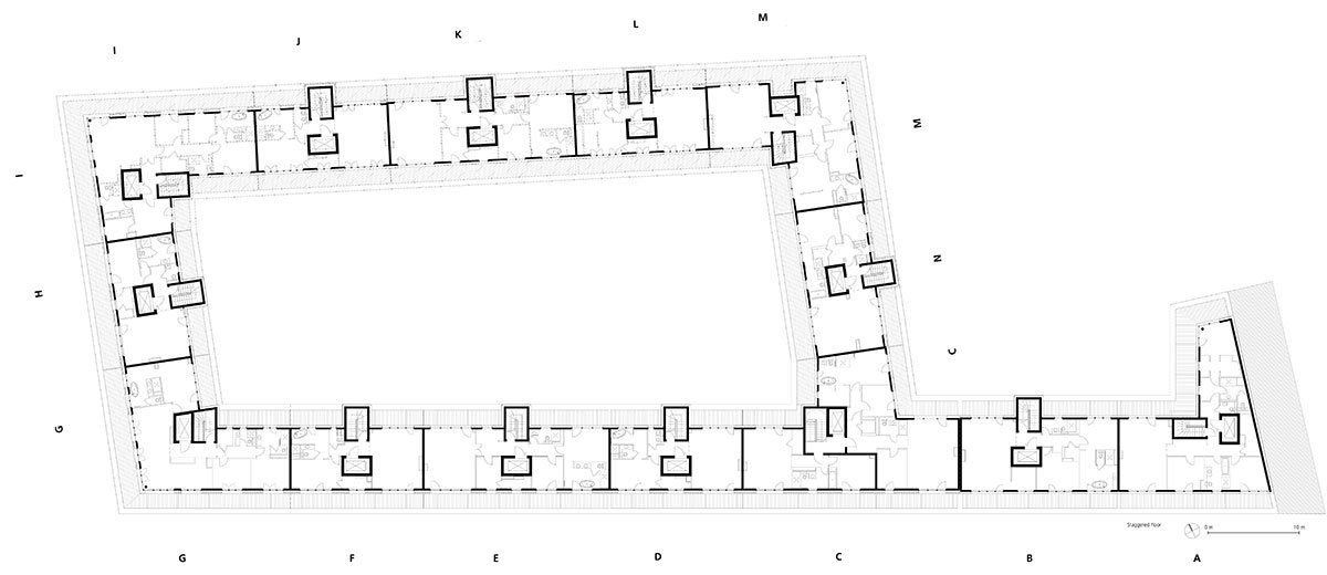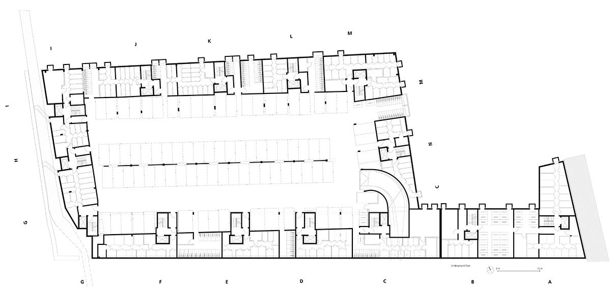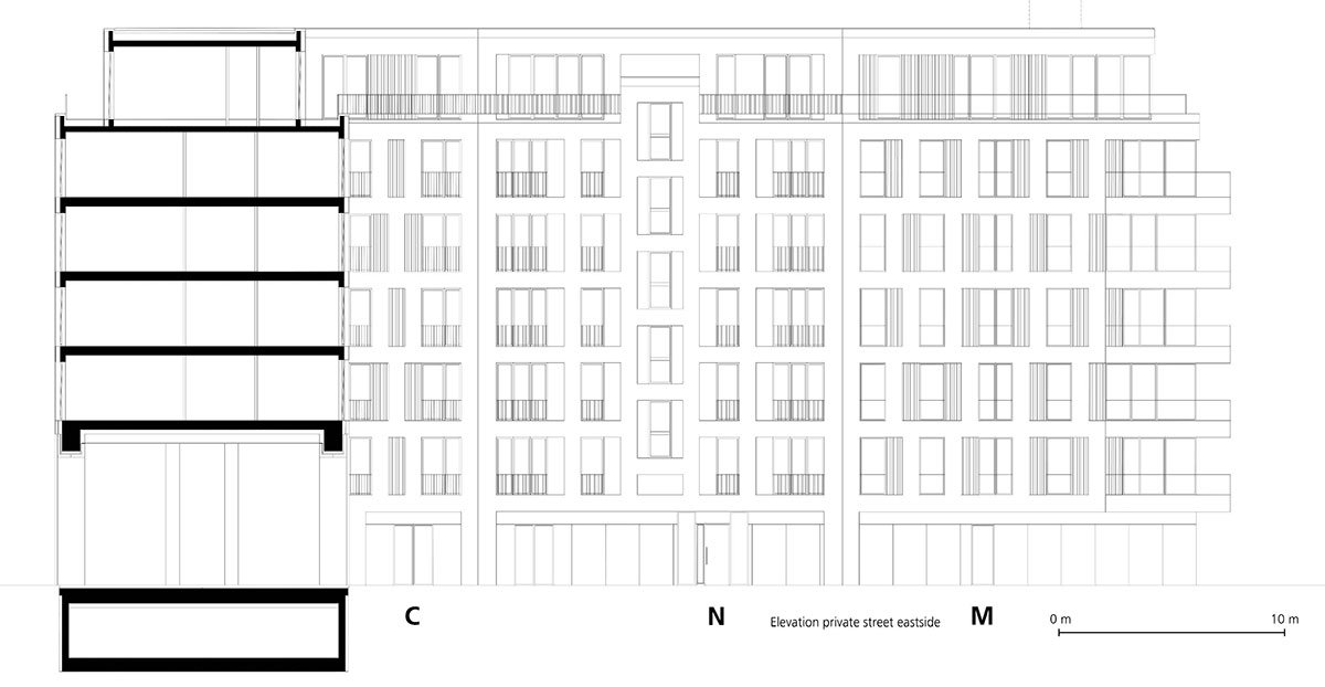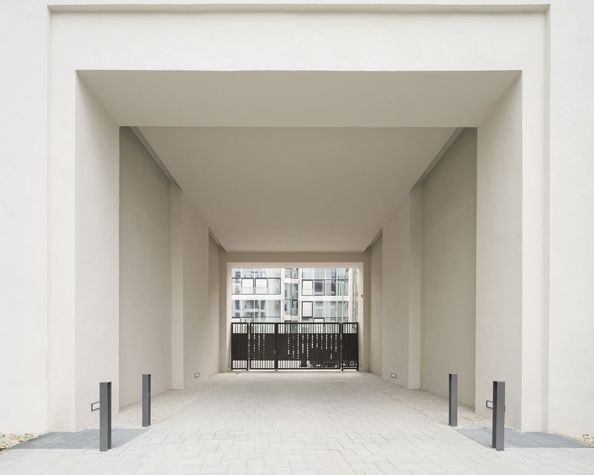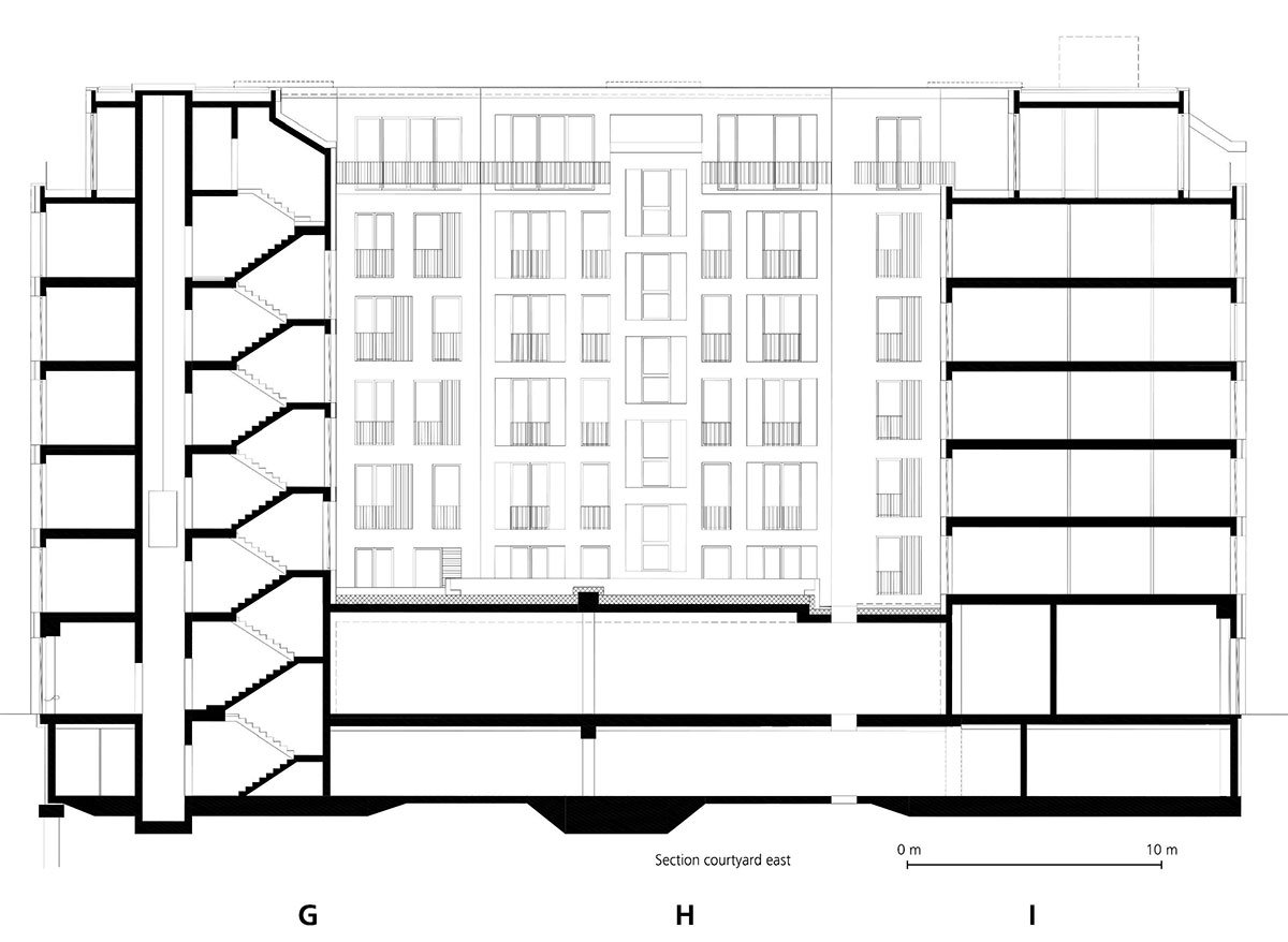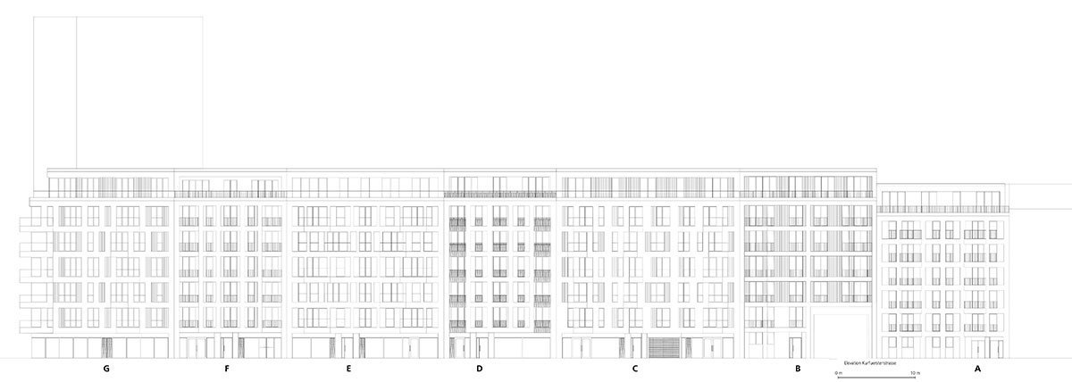 The basic layout of the ensemble of a total of 14 seamlessly connected buildings forms a P with a closed inner courtyard. Six full storeys each support a staggered storey. The diverse urban flair is reflected in the exterior of the complex. The predominantly glazed, commercially used ground floors integrate the row with an inviting front into the street space. While the structure of the upper floors is emphasised vertically throughout, each house stands out with its own design and individual details, such as its own surface material, its different finishes or the design of the balconies.