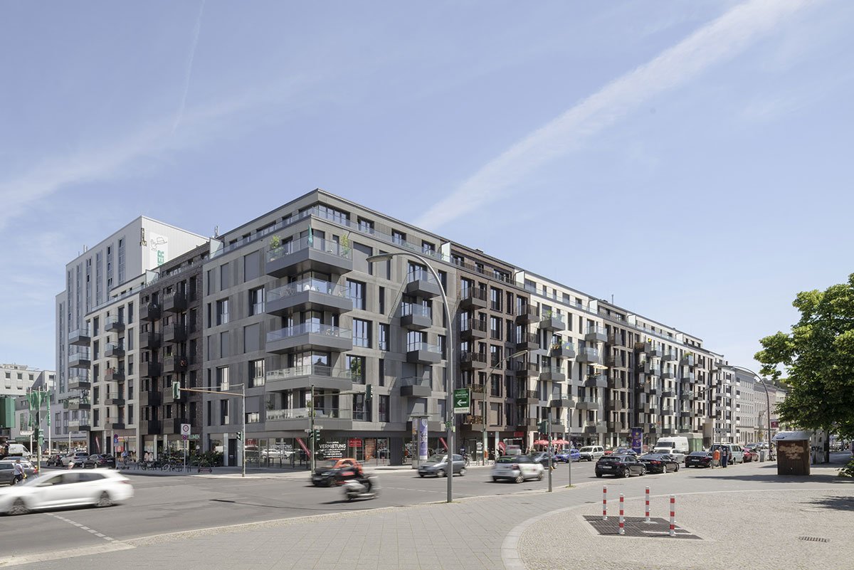 The choice of individual materials for the multi-faceted facades is a reference to Berlin’s architectural heritage: bricks, masonry in colour and pattern variations refer to church and industrial buildings, fluted plaster to the Wilhelminian period, exposed concrete and glass speak the language of today’s Berlin. The plastered facades in the inner courtyard show a similar design with colours and surfaces as the street facades.