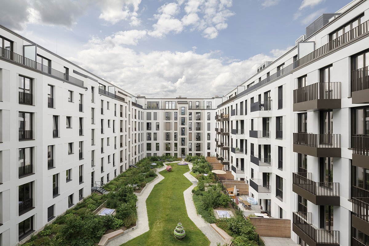 A total of 182 apartments will be created here, and there are 86 parking spaces in the shared underground car park. The size of the one- to two-room apartments ranges from 46 to 146 square meters. To the north and east, the ground floor apartments will have terraced areas with small front gardens of shrubs and trees and play areas. The project is a KfW Efficiency House 55.