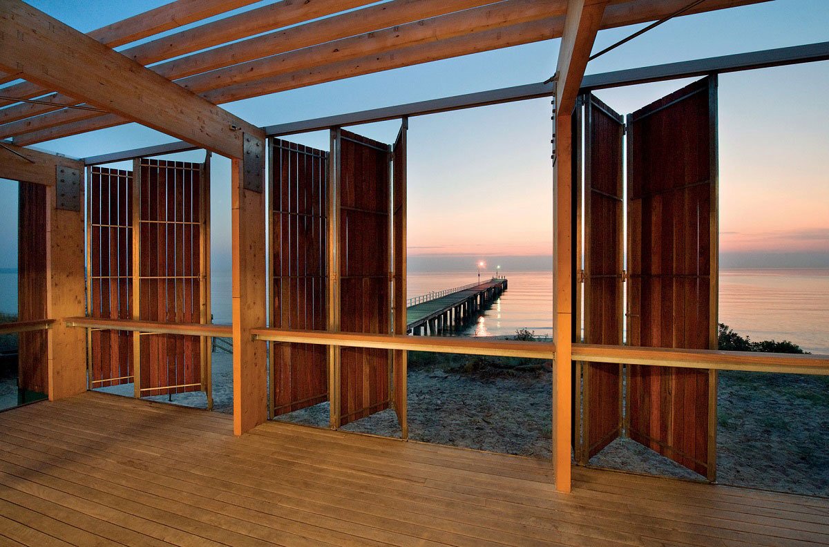 Materials used in the building’s construction were deliberately selected based on their durability in coastal conditions. The use of timber throughout was also intended to draw attention to the fundamental spatial characteristics of the buildings while providing a neutral backdrop for the contrast between shadow darkness and bright beach-light.