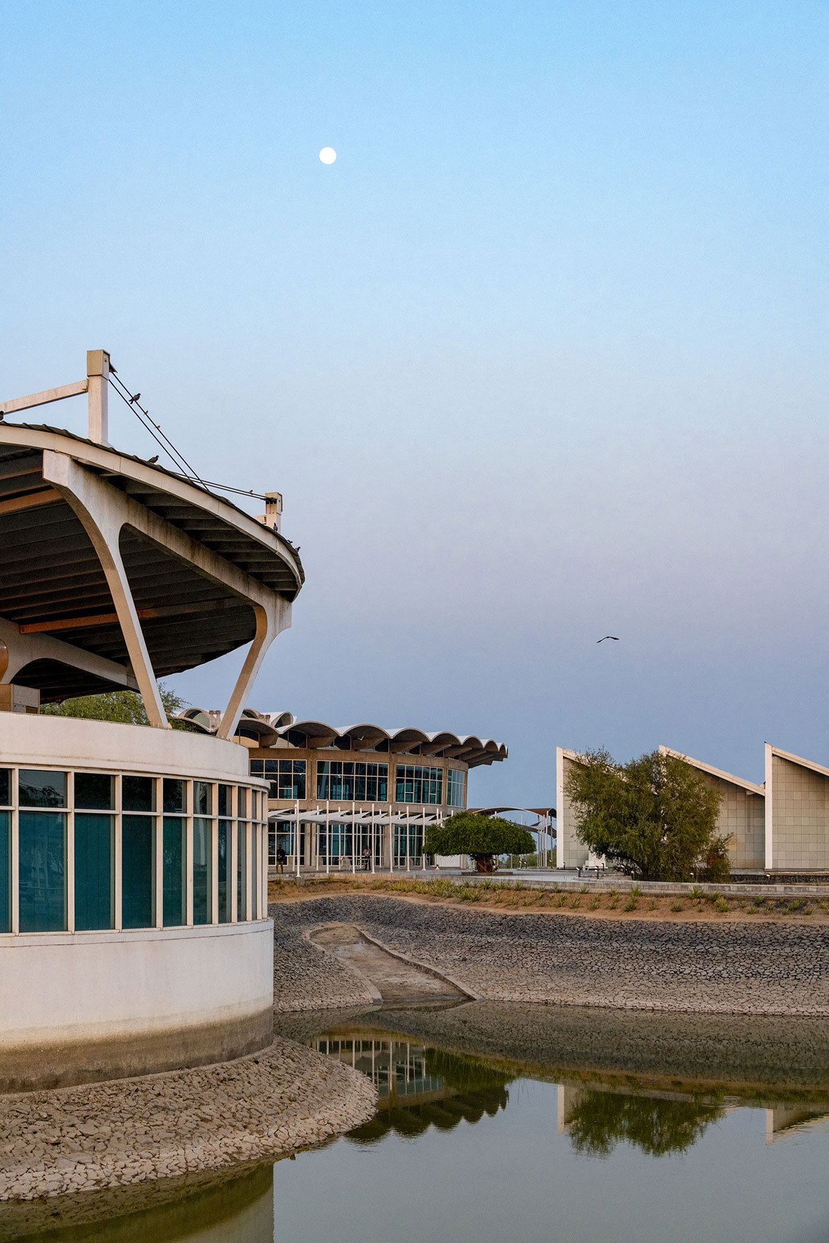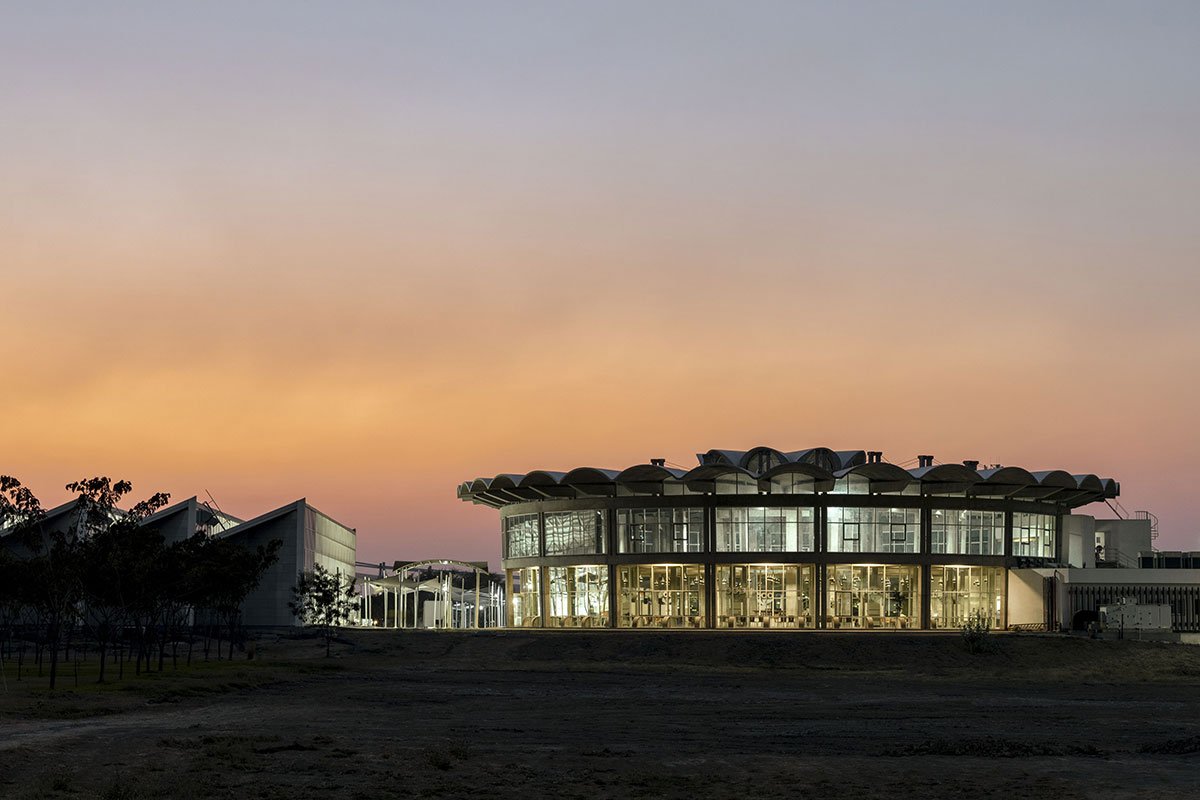 A canteen and recreation hub dedicated to Balkrishna Doshi, which sits at the heart of the development, is designed to counter the white, functional appearance of the manufacturing and utility buildings, and is a playful addition to the site. Exposed concrete is juxtaposed with a characteristic corten steel entrance canopy, distinguishing the leisure area from neighbouring work areas on the site.