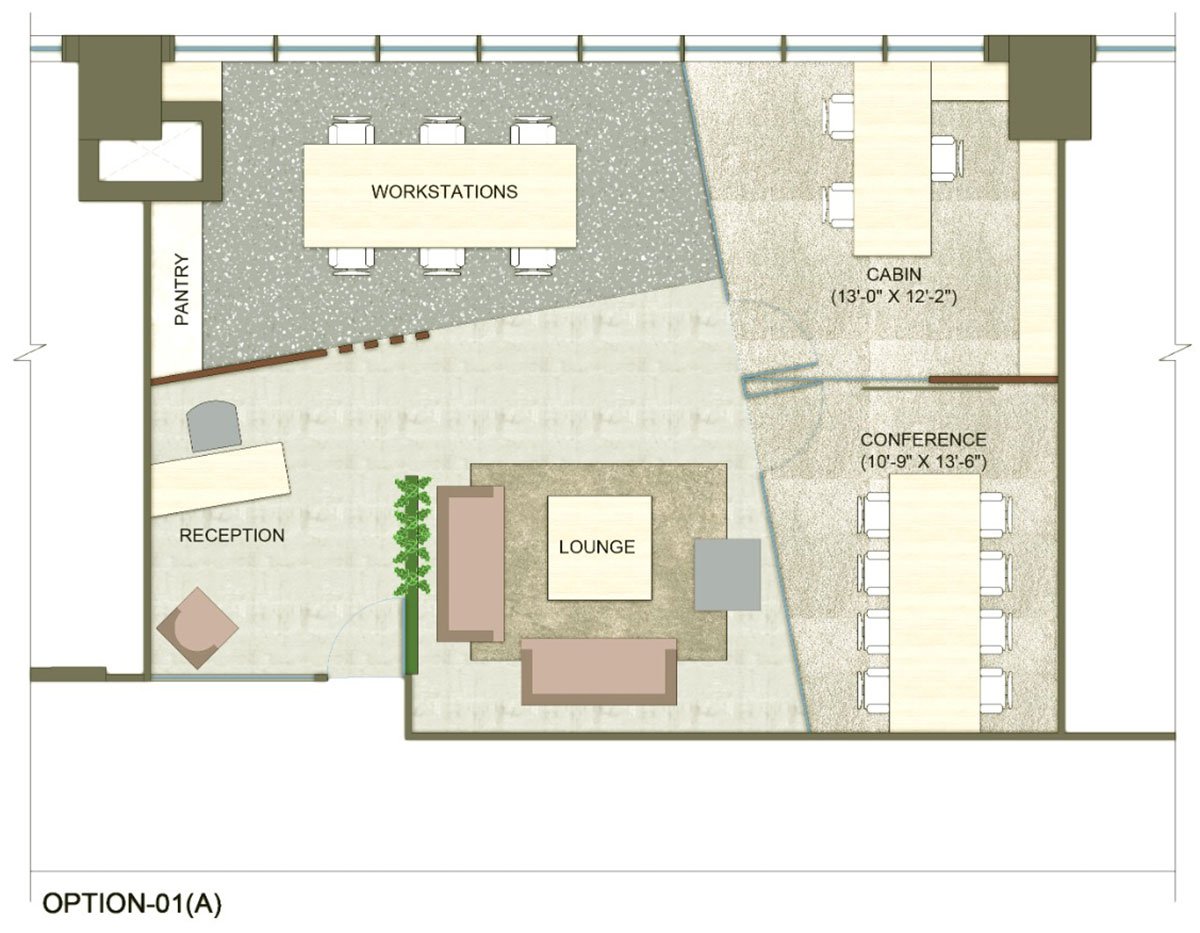Should the tenant wish to switch up the furniture layout, all that is required is moving the loose furniture from the lounge to accommodate for the extra workstations and adding a glass partition to separate the smaller meeting room. The data and electrical lines are set in place and concealed, factoring in electrical connections for both layouts of the space. The fixtures for a workspace of this nature are kept mid-ranged and easy to execute. With veneer on the reception’s back wall and laminate cladded furniture, a module is formed for quick implementation and designed to be leased out. The lights are strategically picked in a combination of high-end and mid-ranged, for their visual appeal and overall aesthetic.