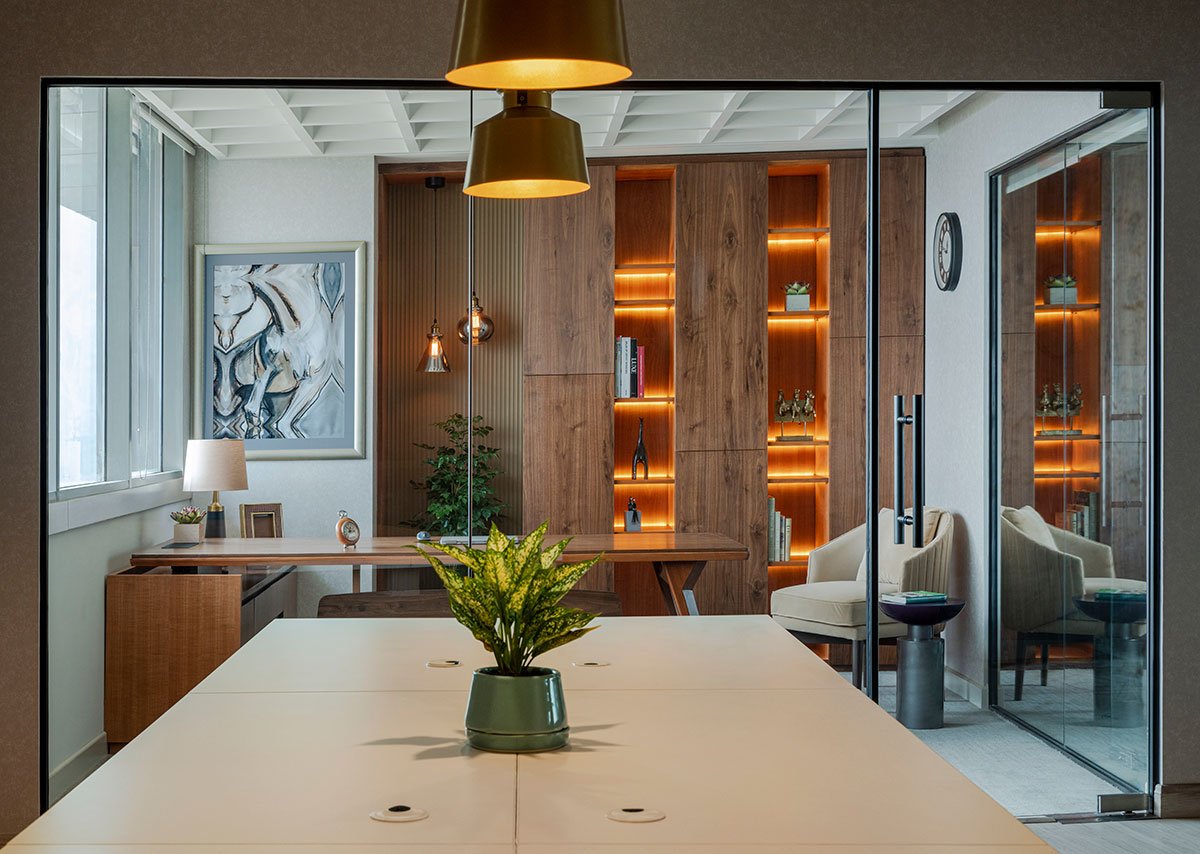 The wooden partition, clad with veneer, tapers away from the reception into the lounge, naturally broadening the space and allowing natural light to filter in till the checked glass partition on the opposite side of the lounge abutting the passageway. Perpendicular to this wooden partition is a glass partition that runs from the window to the passageway. This forms the main wall to the right of which, lie the cabin and conference rooms. These two rooms are separated by another glass partition with blinds on both sides, for privacy, that also allows light from the window to pass through the cabin into the conference room.