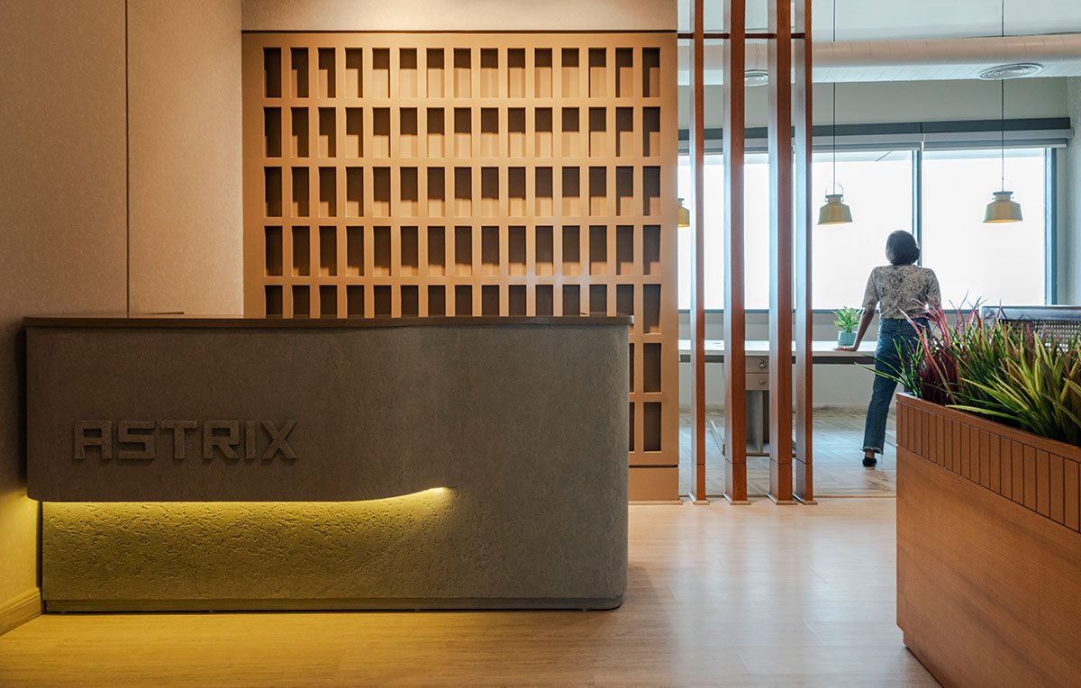 The first office layout starts off at the passageway, where the entrance door opens to reveal a chic reception. The tonality of muted interiors with toned down colours is established here, anchored by the reception table which has the *Asterix* logo embossed in MDF, in a concrete finish. A wooden partition that forms the backdrop of the reception, continues on as wooden slats and further opens up the room into a lounge. Behind the wooden partition is the pantry and reprography station and the area in front of the pantry houses six workstations, which enjoy an abundance of natural light from the massive window adjacent to it. An interesting feature is the change in flooring from the lounge to the workstation area, that demarcates the change in functionality of the space. The workstation features herringbone patterned flooring in light grey, with the lounge having wooden planks in the same colour. The same muted colour is also introduced in the furniture through the use of cane.