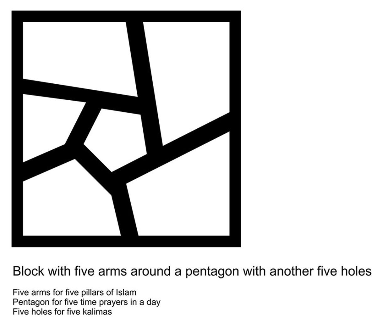 A single block is designed with five arms around a pentagon with another five holes, which reflect the magnificent number ‘five’ in Islam. Five pillars of Islam, five times prayer in a day and five Kalimas.