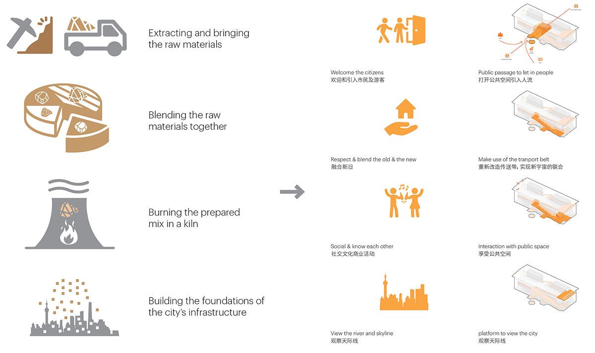 The site of the GATE M Dream Center was once home to the Shanghai Cement Factory, at one time the largest cement factory in Asia. The 2010 Shanghai Expo provided the catalyst for the city to relocate the factory, along with other industrial functions in this part of the city, and to make the banks of the Huangpu River accessible to the city’s residents. Before MVRDV’s transformation, the site was home to two very different sets of buildings: a handful of large industrial structures provided reminders of the area’s history, while the in-between spaces hosted unfinished constructions from a prior development attempt that never came to fruition.