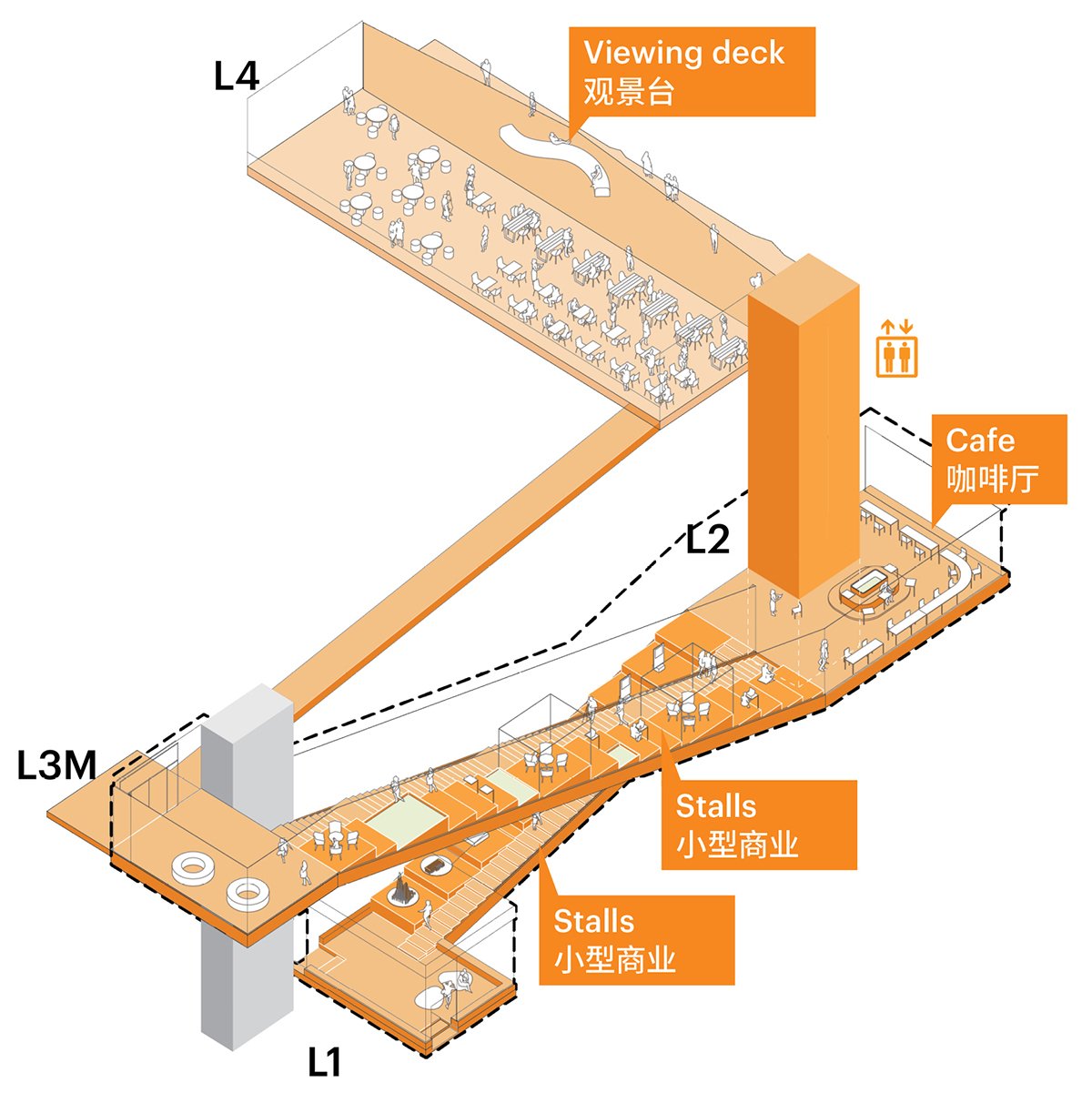 The remaining industrial silos and factory buildings form the focal points of the new zone. These raw, monumental concrete structures bring a clear sense of history and identity, made more striking by the addition of bright orange staircases and elevator shafts to their exteriors. On its lower floor, the massive M Factory building hosts BLOOMARKET, which combines a food market and a fine dining experience, while the upper floor – accessible via an orange staircase created from what was once a conveyor belt – hosts a large, column-free cultural space that can be used for anything from exhibitions and conferences to fashion shows and stage performances. Meanwhile, the large silo building has been converted internally to become a centre for rock-climbing, with orange routes on the exterior that invite people to viewing platforms on the roof and a first-floor balcony.