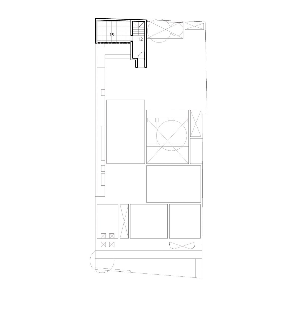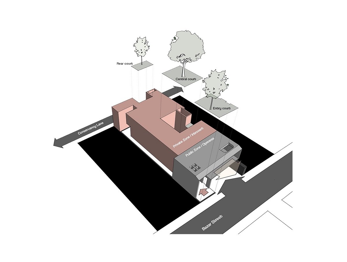 The house form is an adaptation of the prevalent residential archetype, which response to the local climate by being linear and having multiple courts. The planning strategy of the house involves an arrangement of the primary spaces along the east-west axis. The west end of the axis houses the entry court from the Bazaar street side while passing through the central court in the private realm before terminating at a court on the east posterior end which faces the conservancy lane.