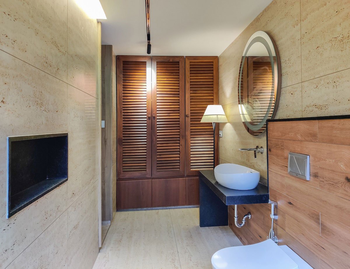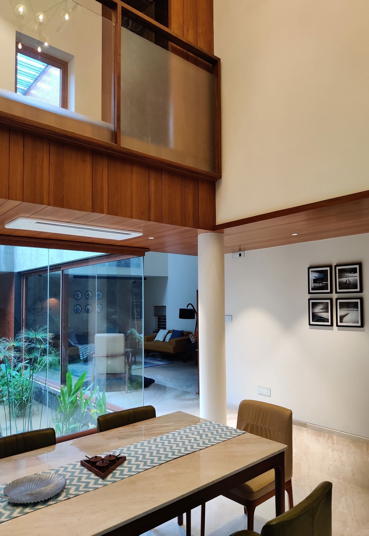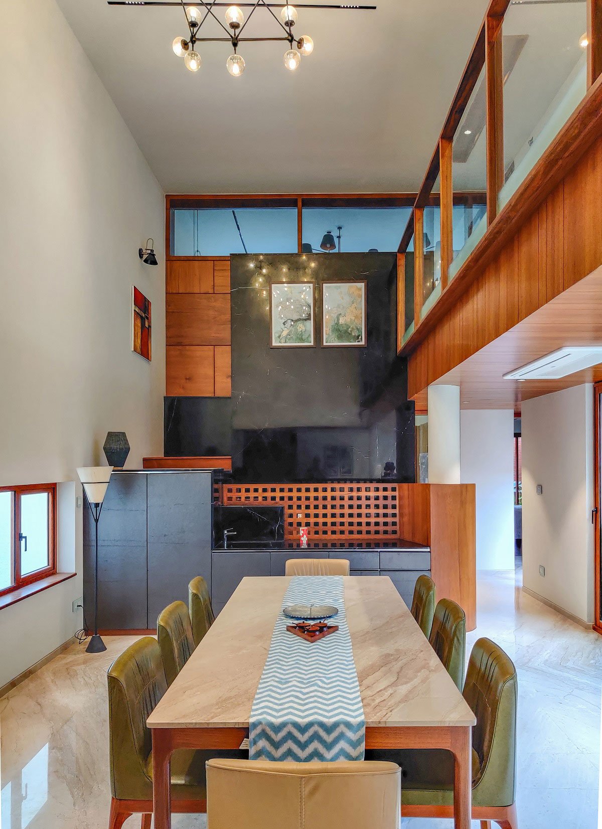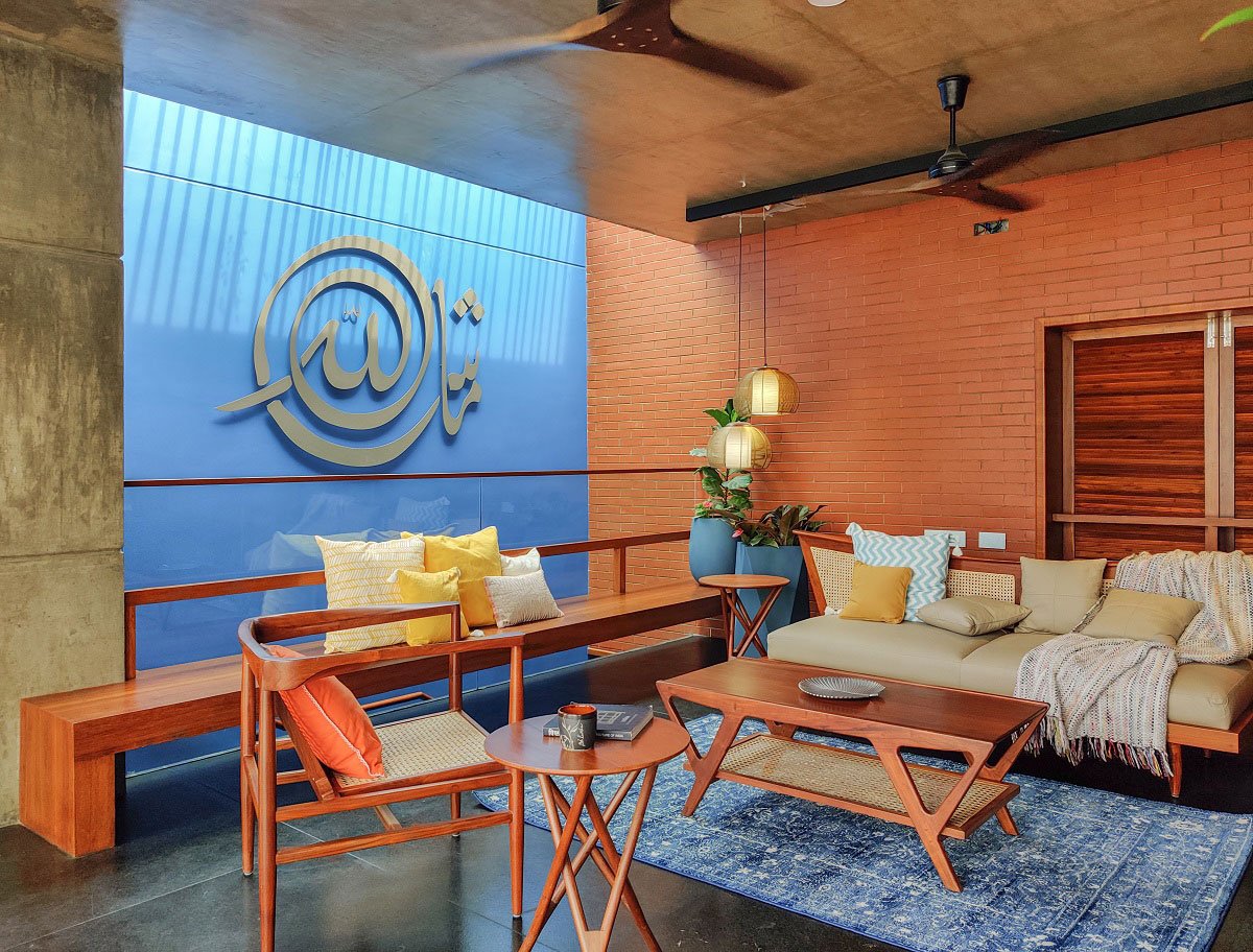 The two-third posterior becomes the private realm for the family which is an introverted mass achieved by thick exposed brick walls, functionally aiding to achieve thermal comfort. In contrast to the exterior, the interior displays a softer side with white walls, beige marble and warm wood.