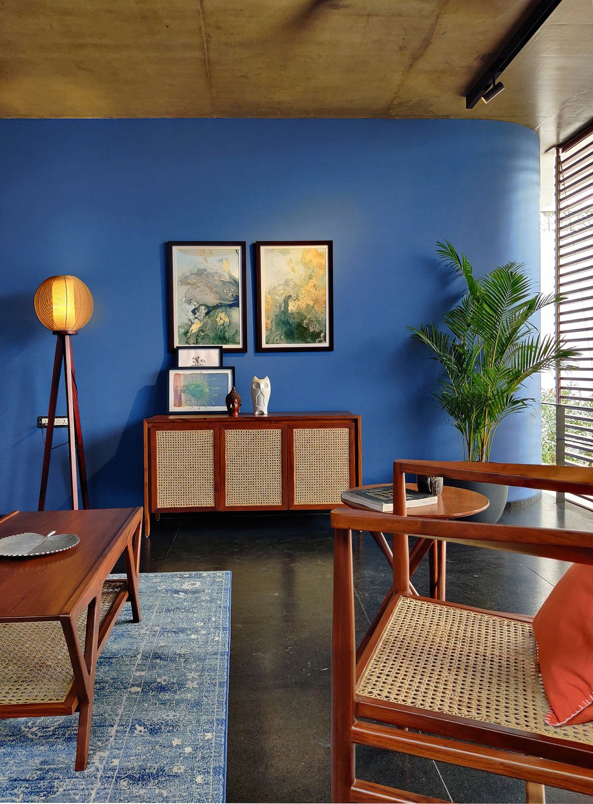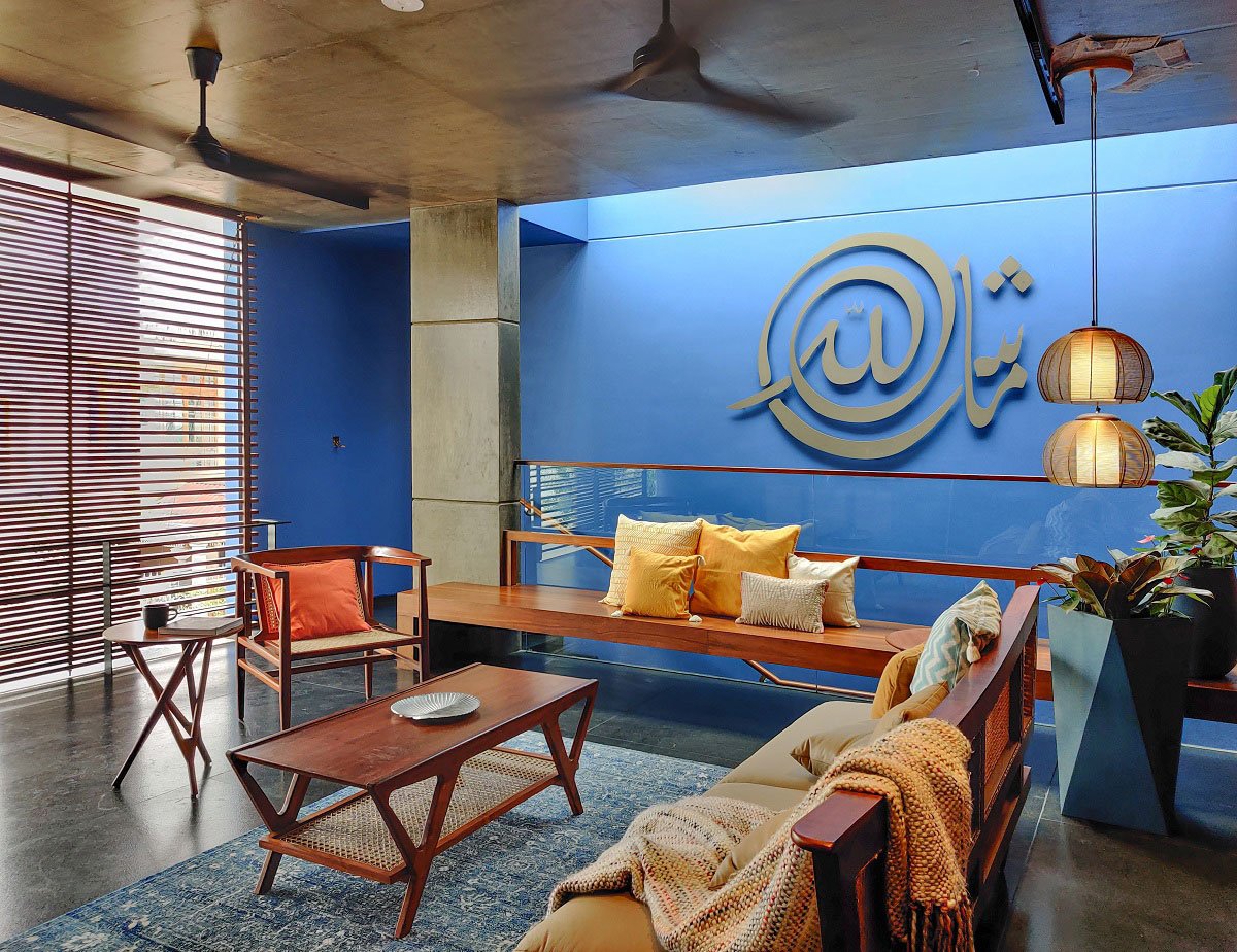 Owing to the demands placed by the family’s Islamic lifestyle and the client’s personality, the house is divided into two parts. This division is clearly visible with the change in the use of materials. The one-third anterior, which acts as a public domain where the client engages with the members of the neighborhood (which he fondly refers to as his ‘Basthi’ ), is an expression of exposed concrete holding a symbolic value of family strength and permanence of their values. It’s rustic and robust in its monolithic appearance of a form folding concrete slab bending and turning to the desired profile.