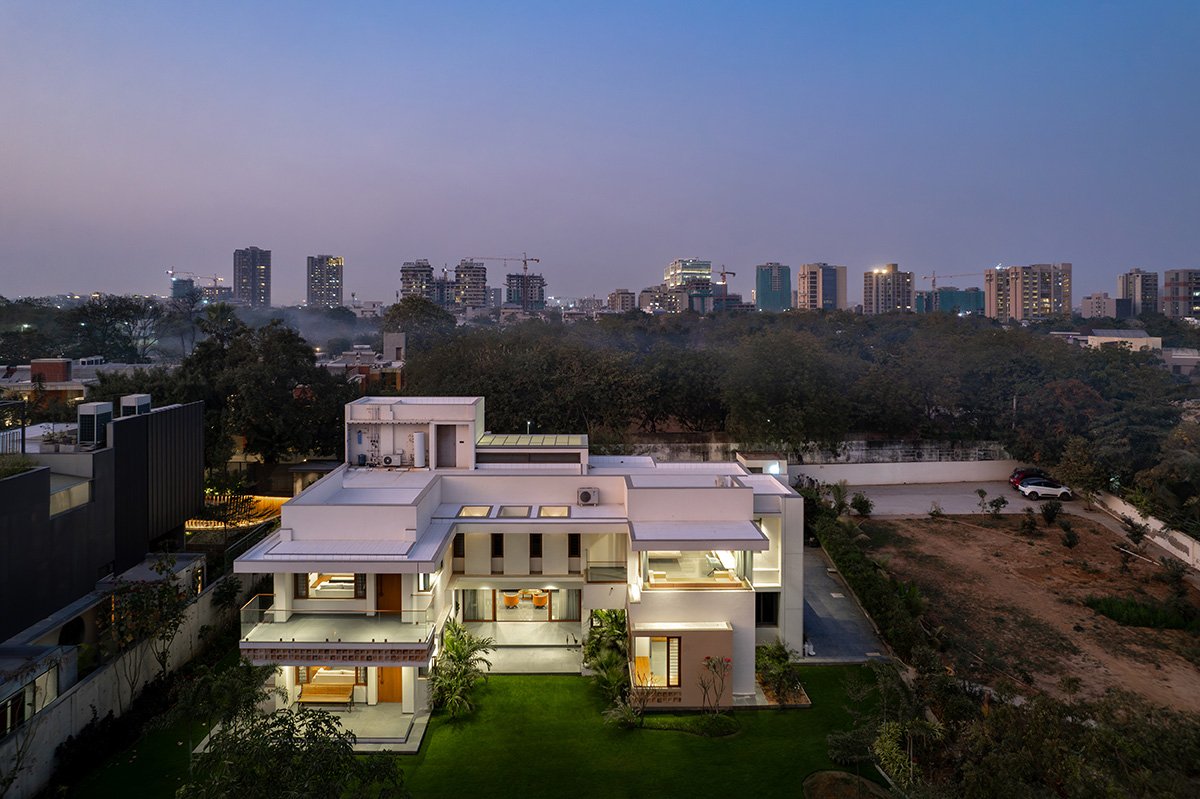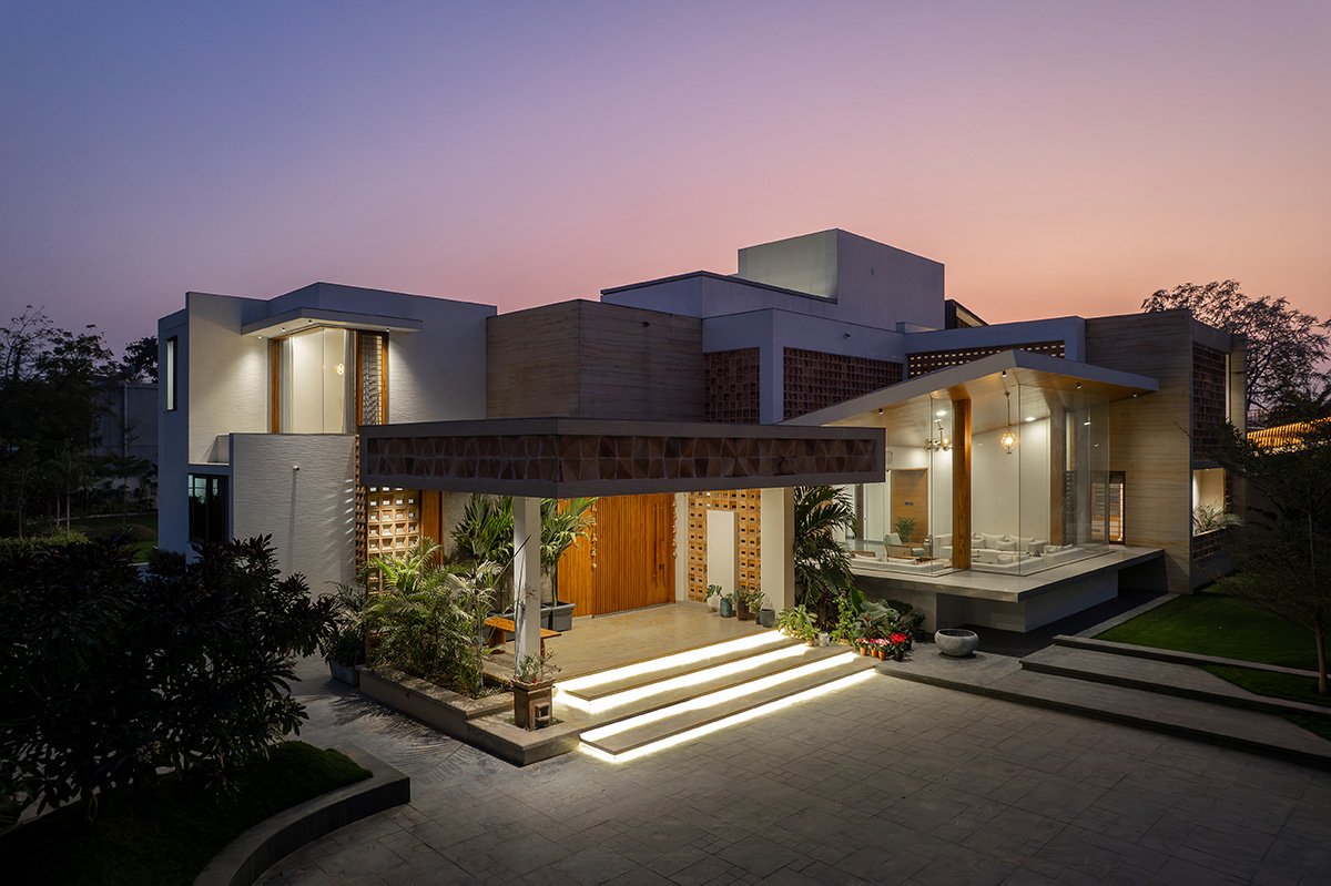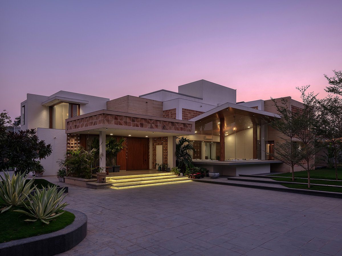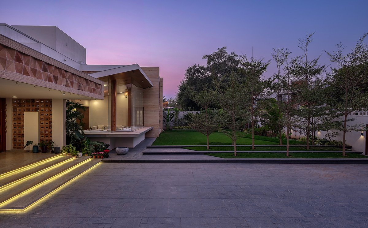 [Text as submitted by architect] Step into Shivoham Villa, nestled amidst Ahmedabad, and find yourself enveloped by a meticulously planned landscape. Lush gardens, a vibrant tapestry of exotic and native flora, blur the lines between indoors and outdoors. Traveller’s Palms, Areca Palms, and Foxtail Palms sway gently, their fronds rustling in the breeze. Smaller palms like Raphis and Kentia add delicate touches, while bursts of color from Red Cerbera Odollam Rubra and Red Champa create focal points throughout. Native Indian trees like Keigilia Africana, Pangaro, and Jarul add a dynamic element, their hues reflecting the changing seasons. Native shrubs further enhance the experience with their fragrant blooms, attracting a symphony of butterflies and bees.