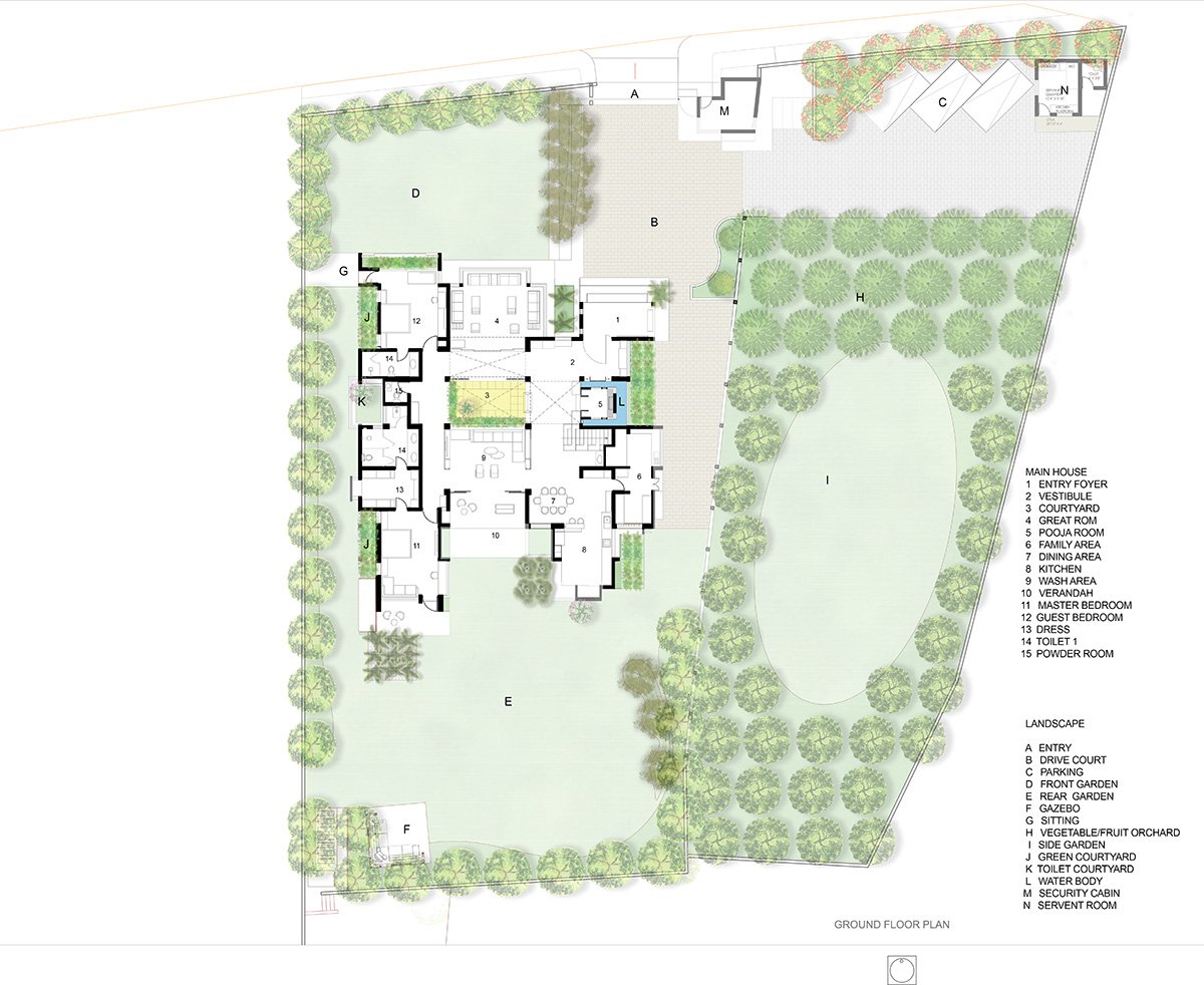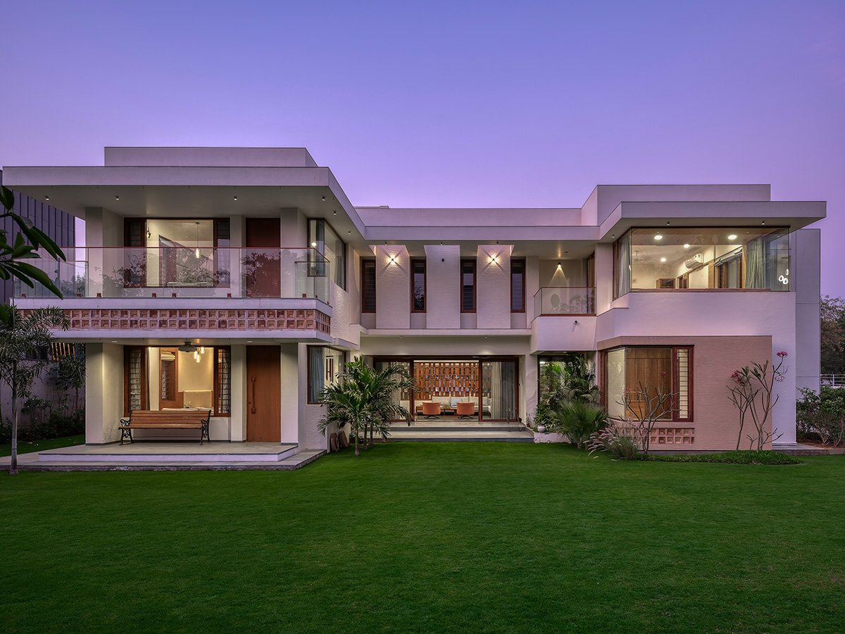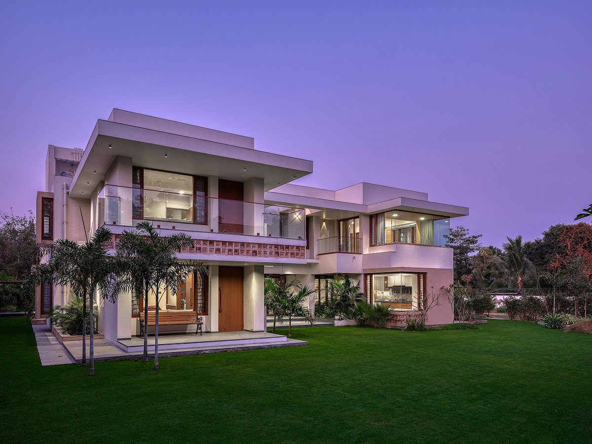 [Text as submitted by architect] Step into Shivoham Villa, nestled amidst Ahmedabad, and find yourself enveloped by a meticulously planned landscape. Lush gardens, a vibrant tapestry of exotic and native flora, blur the lines between indoors and outdoors. Traveller’s Palms, Areca Palms, and Foxtail Palms sway gently, their fronds rustling in the breeze. Smaller palms like Raphis and Kentia add delicate touches, while bursts of color from Red Cerbera Odollam Rubra and Red Champa create focal points throughout. Native Indian trees like Keigilia Africana, Pangaro, and Jarul add a dynamic element, their hues reflecting the changing seasons. Native shrubs further enhance the experience with their fragrant blooms, attracting a symphony of butterflies and bees.