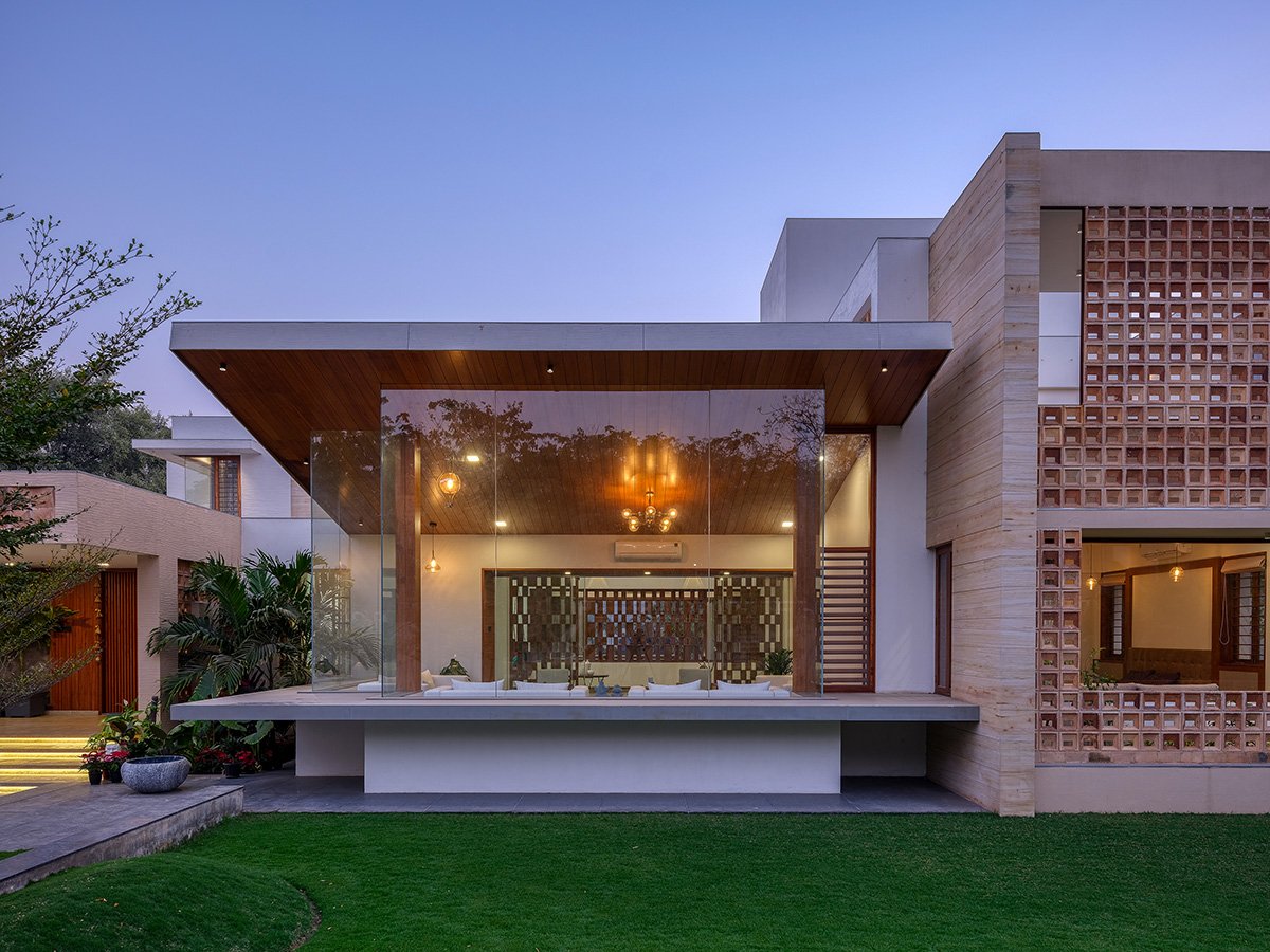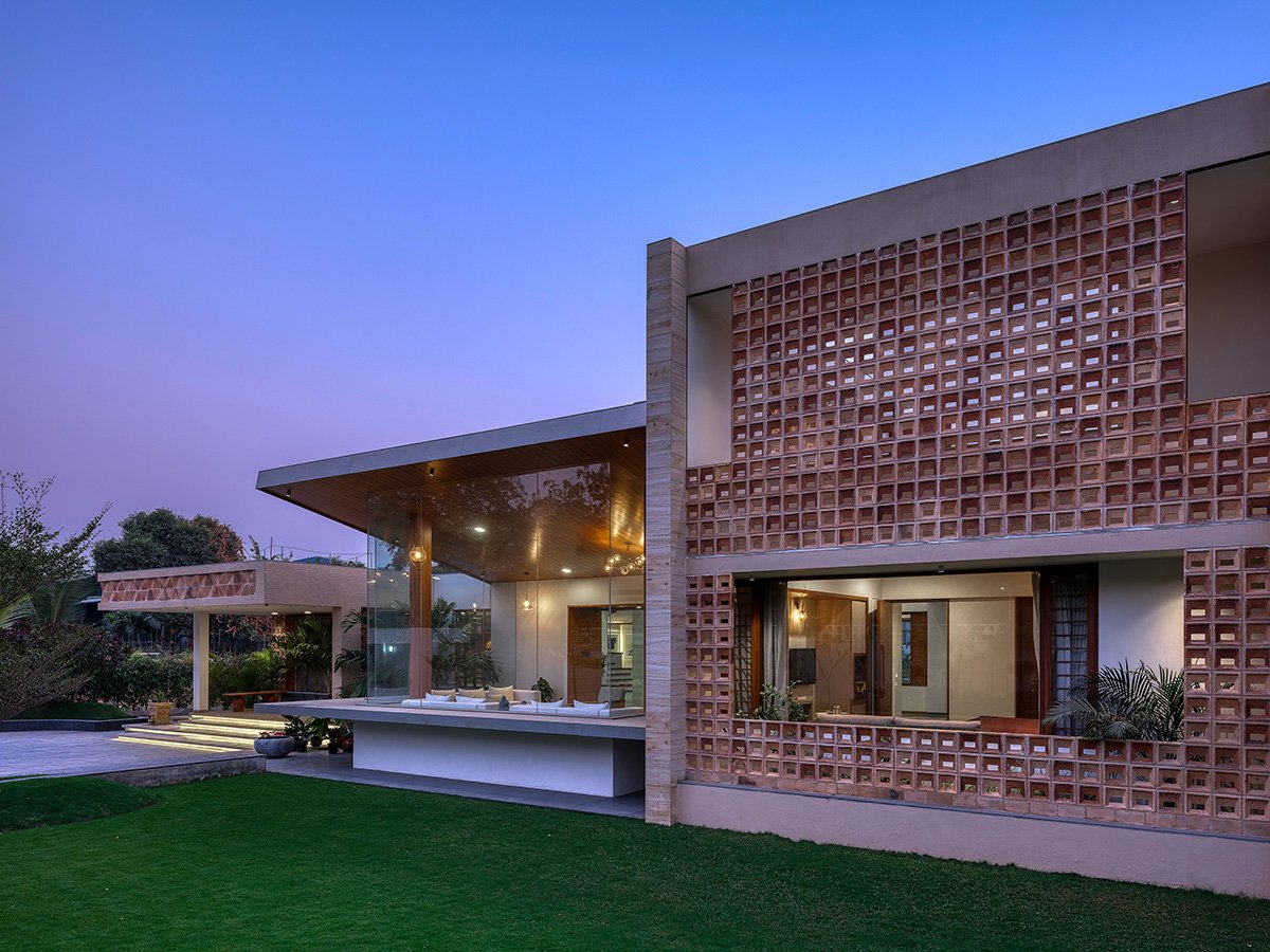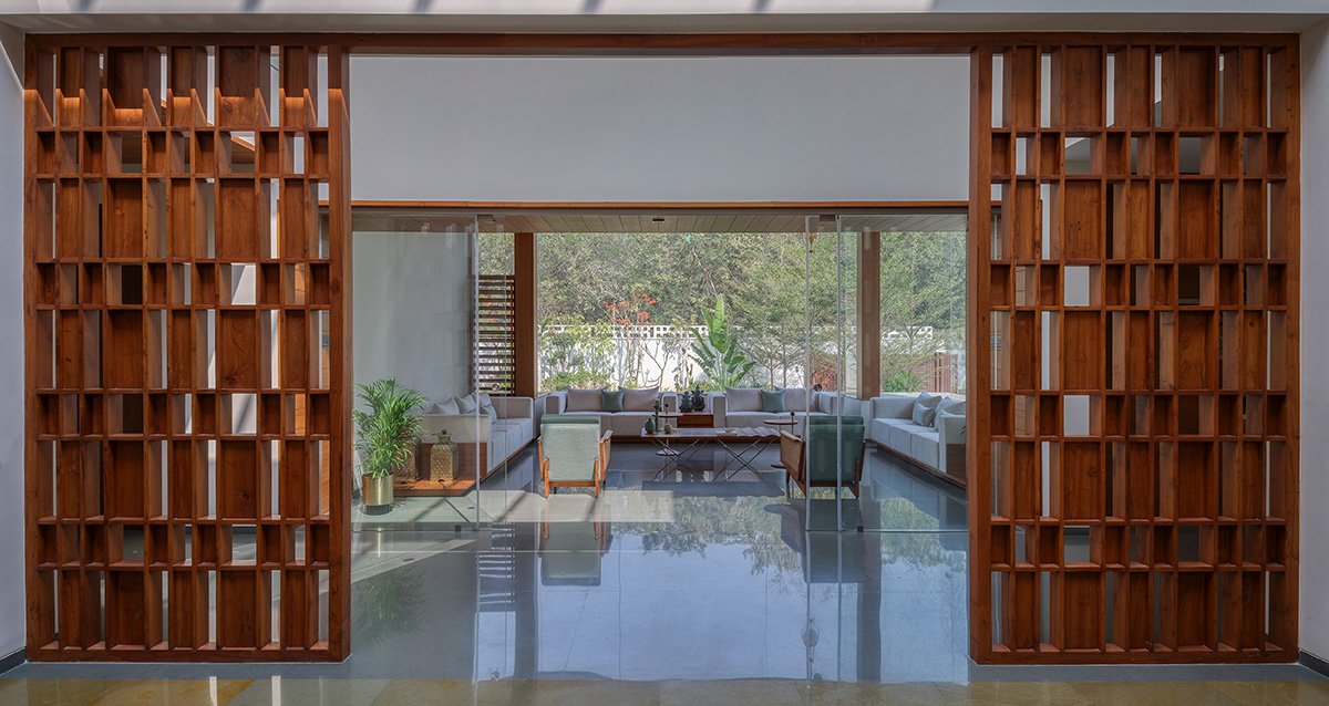 Natural Materials Create Warmth and Character: The residence celebrates natural materials and light. Polished kota stone floors provide a cool foundation, while recycled Valsadi teak wood, sourced from an old house in Patan, lends warmth and character throughout. Stairs, screens, furniture, doors, and other elements all benefit from this beautiful wood. Ceramic jaali panels adorn the façade, echoing the organic forms of the landscape and filtering natural light into the interiors.
