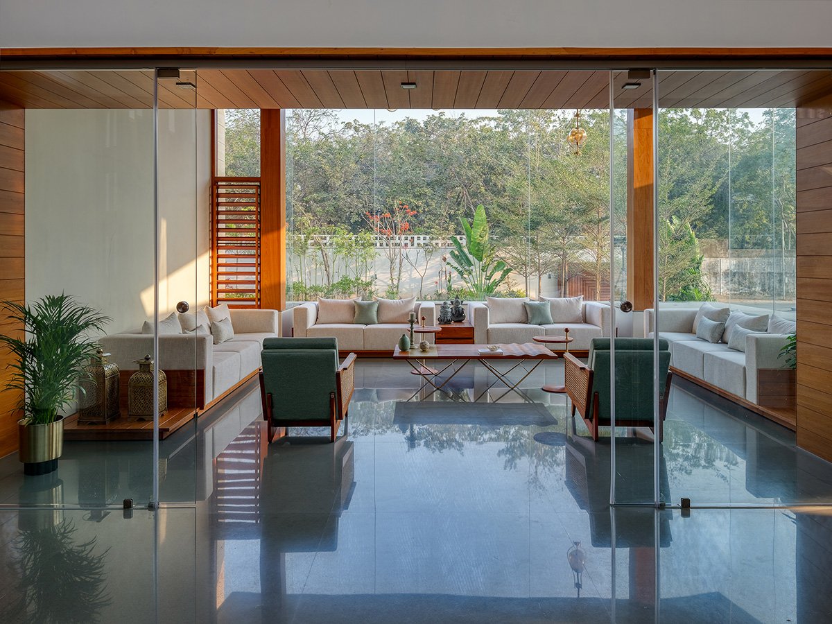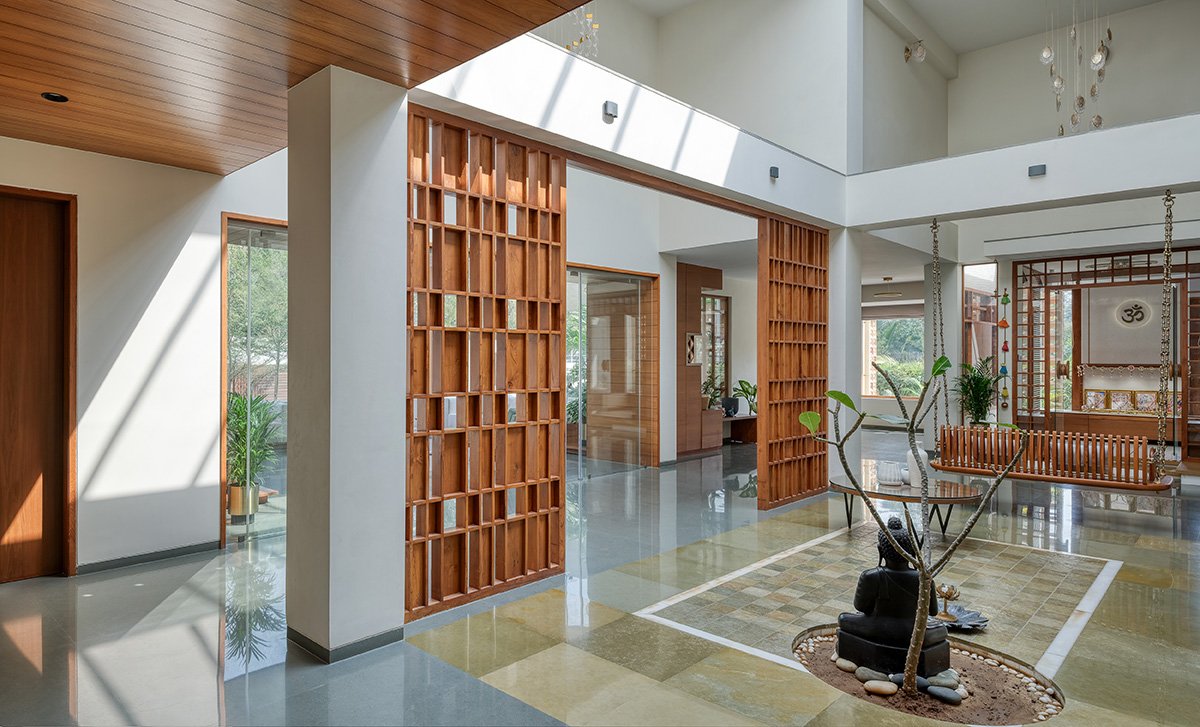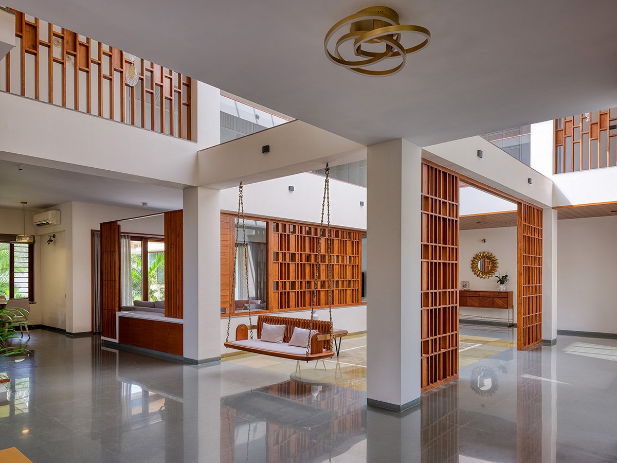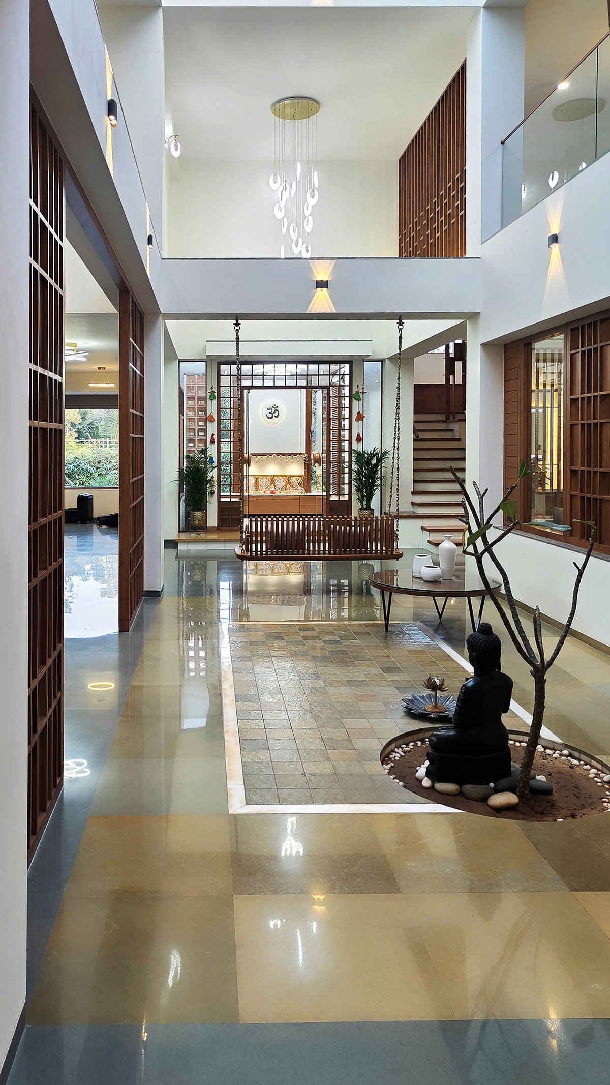 A Home Bathed in Natural Light: Facing north, the residence itself is designed to maximize natural light and ventilation. All spaces revolve around a central courtyard with a skylight, the heart of the home. A wooden screen separates the formal living area from the family space, creating privacy while maintaining a connection. The formal drawing room boasts expansive glass walls, offering breathtaking views of the flourishing garden. The puja room, positioned for serenity, opens onto the courtyard, which also features a charming wooden jhula (swing).
