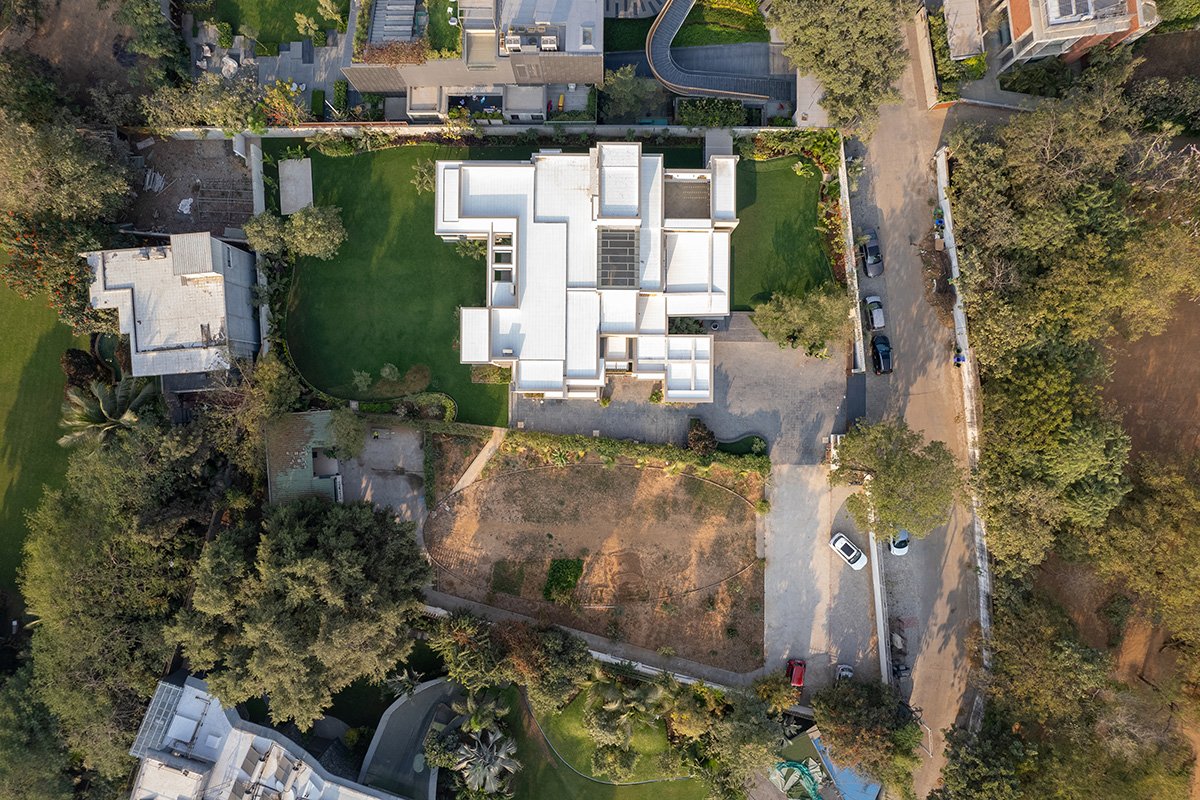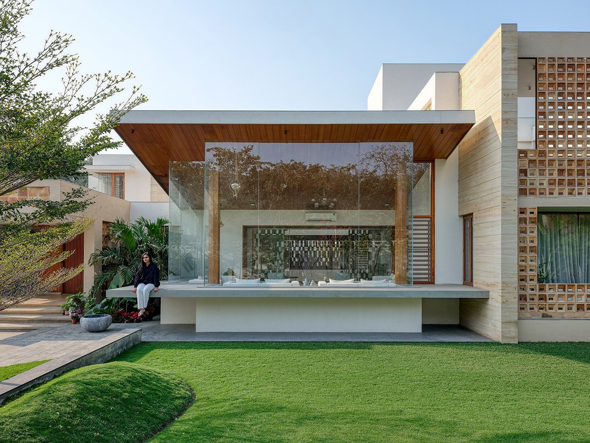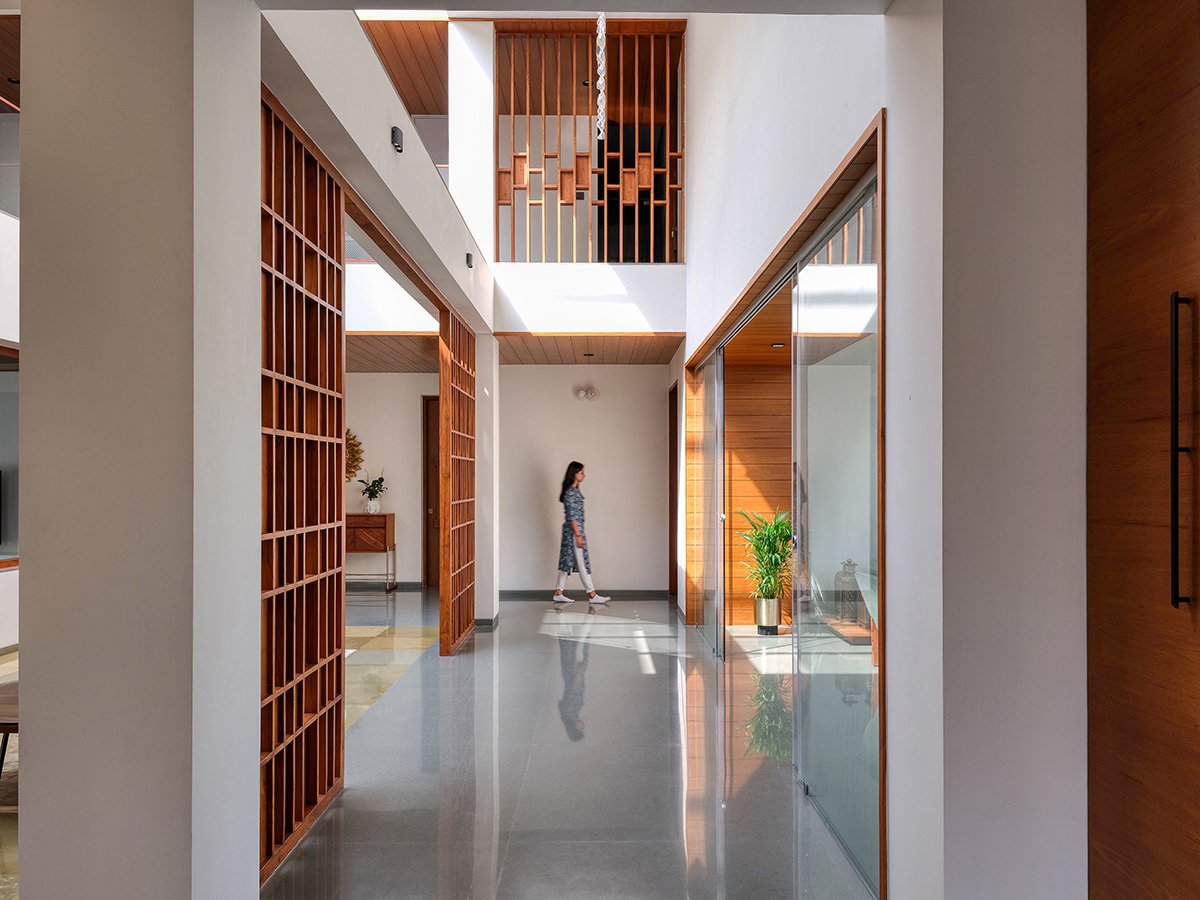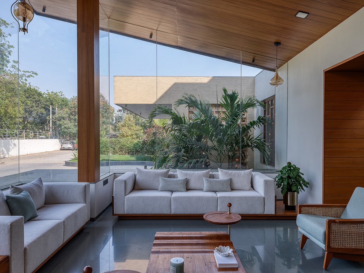 A Home Bathed in Natural Light: Facing north, the residence itself is designed to maximize natural light and ventilation. All spaces revolve around a central courtyard with a skylight, the heart of the home. A wooden screen separates the formal living area from the family space, creating privacy while maintaining a connection. The formal drawing room boasts expansive glass walls, offering breathtaking views of the flourishing garden. The puja room, positioned for serenity, opens onto the courtyard, which also features a charming wooden jhula (swing).