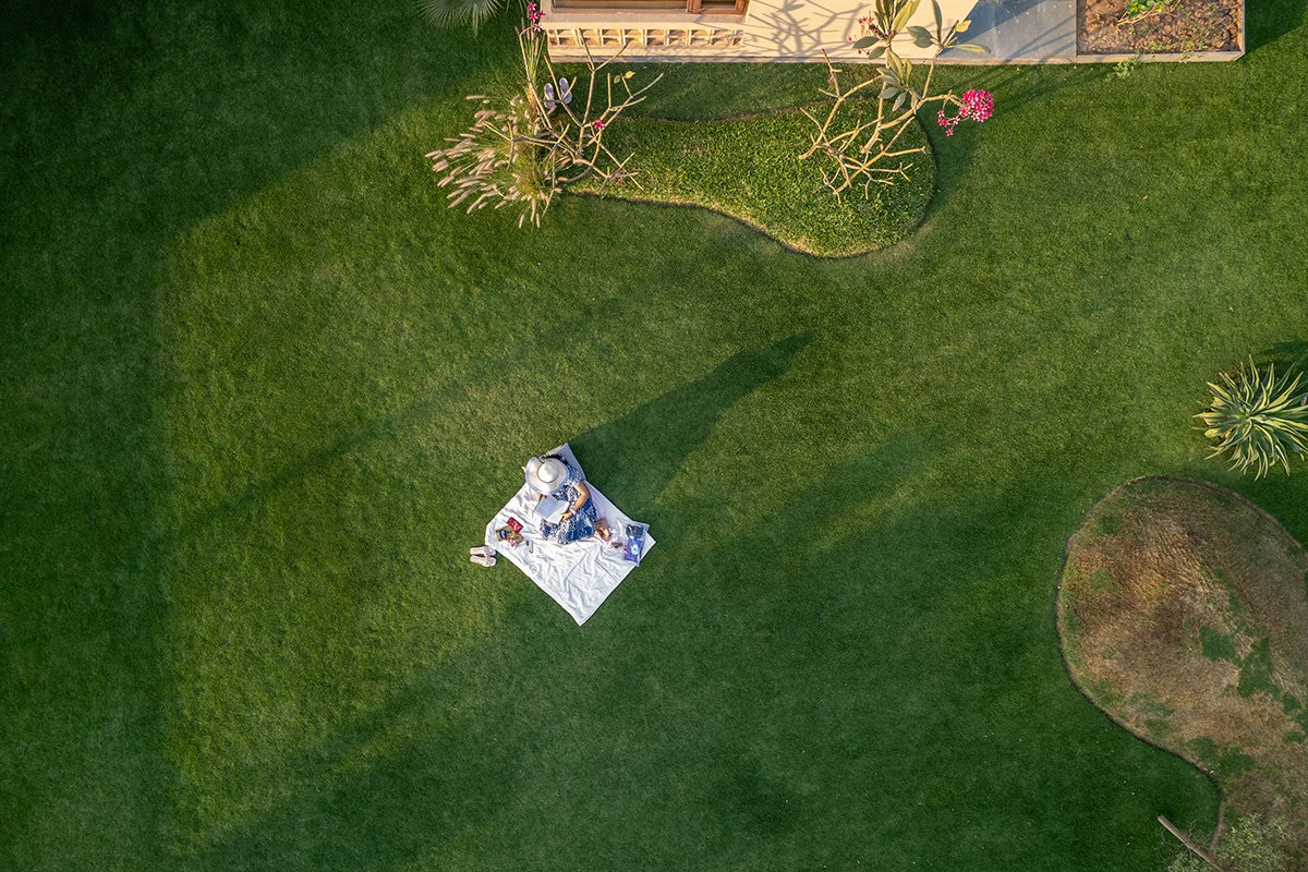 This commitment to organic methods, using cow dung manure and Jivamrut from the client’s Gaushala, nourishes the ecosystem. The resulting haven attracts a resident flock of peacocks, whose presence adds another layer of life to the space.