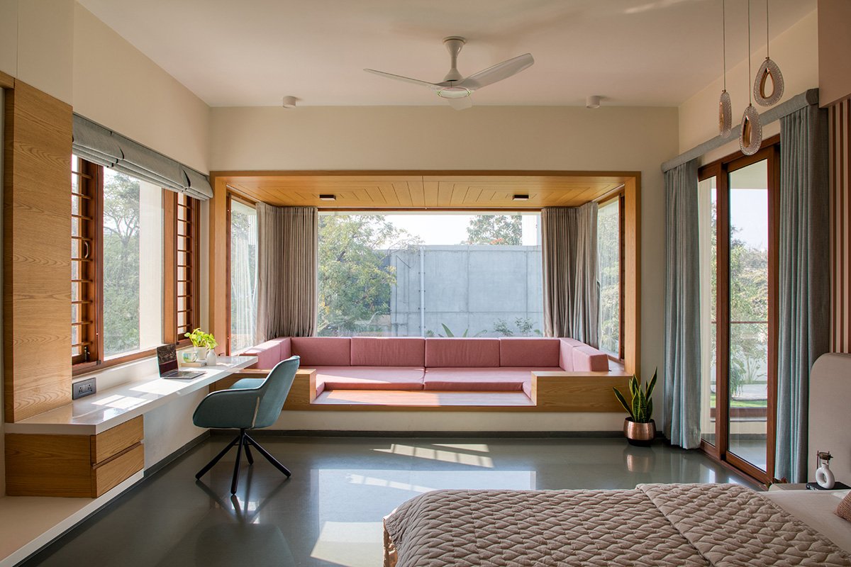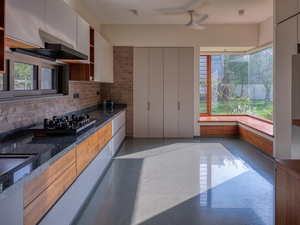 The staircase with an overlooking passage adds a touch of drama to the first floor. The kitchen features a delightful wooden sill bay window overlooking the flourishing landscape. A guest bedroom with a window adorned with ceramic jaali completes the picture, reflecting the seamless blend of nature’s artistry and human design.
