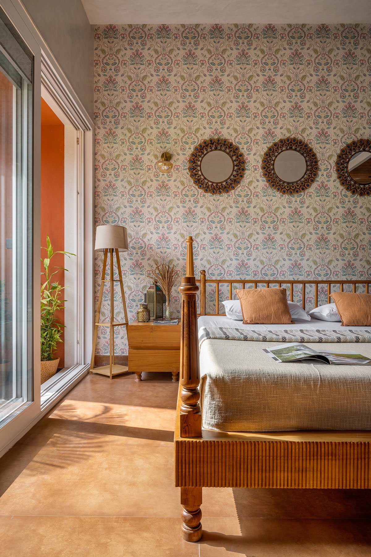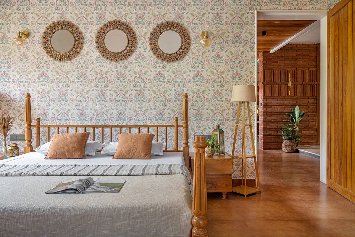The room showcases a blend of tradition and artistic flair, with its distinctive circular mirrors adorned by intricate metal designs that grace the walls behind the bed. These artefacts serve as focal points, instantly drawing attention with their shapes and meticulously crafted details.
