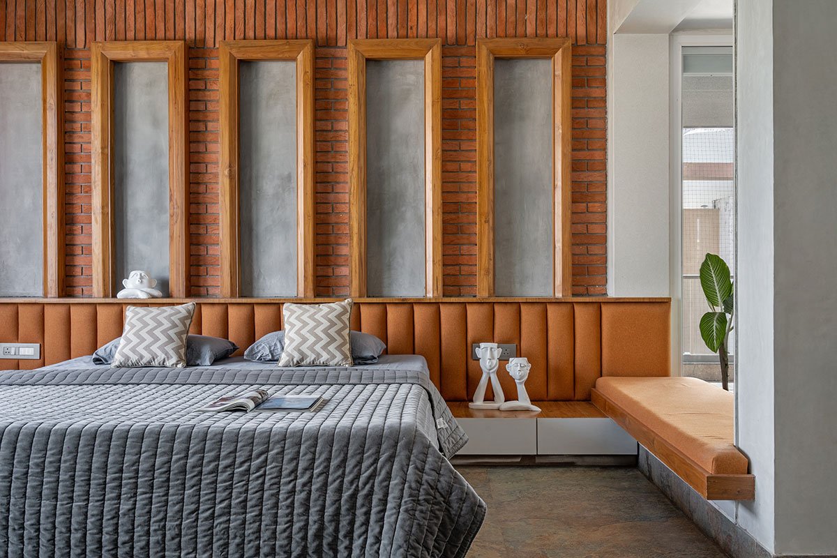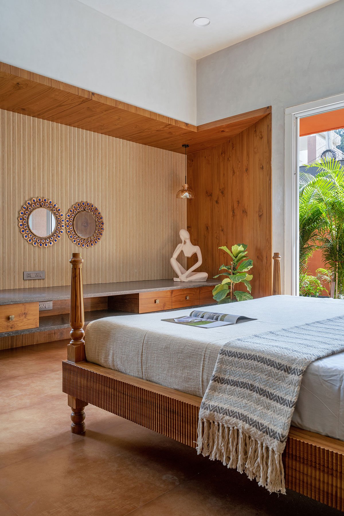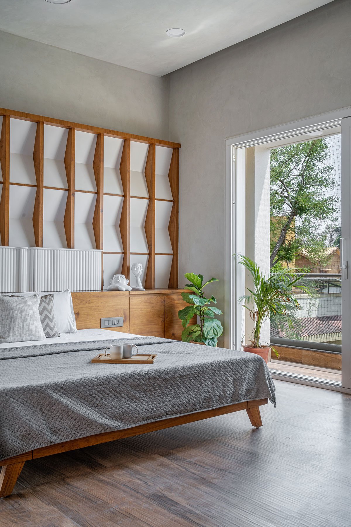 Master Bedroom: The master bedroom exudes a seamless blend of modern luxury and a strong connection with nature. The standout feature is the indoor-outdoor connection, bridging the interior comfort and the allure of the outdoors. The connected balcony, adorned with a carefully designed perforated screen, takes centre stage as a unique element of privacy and elegance.