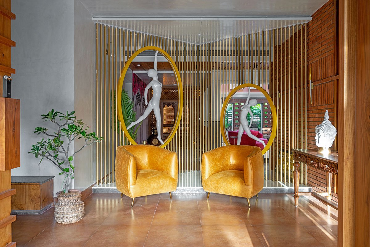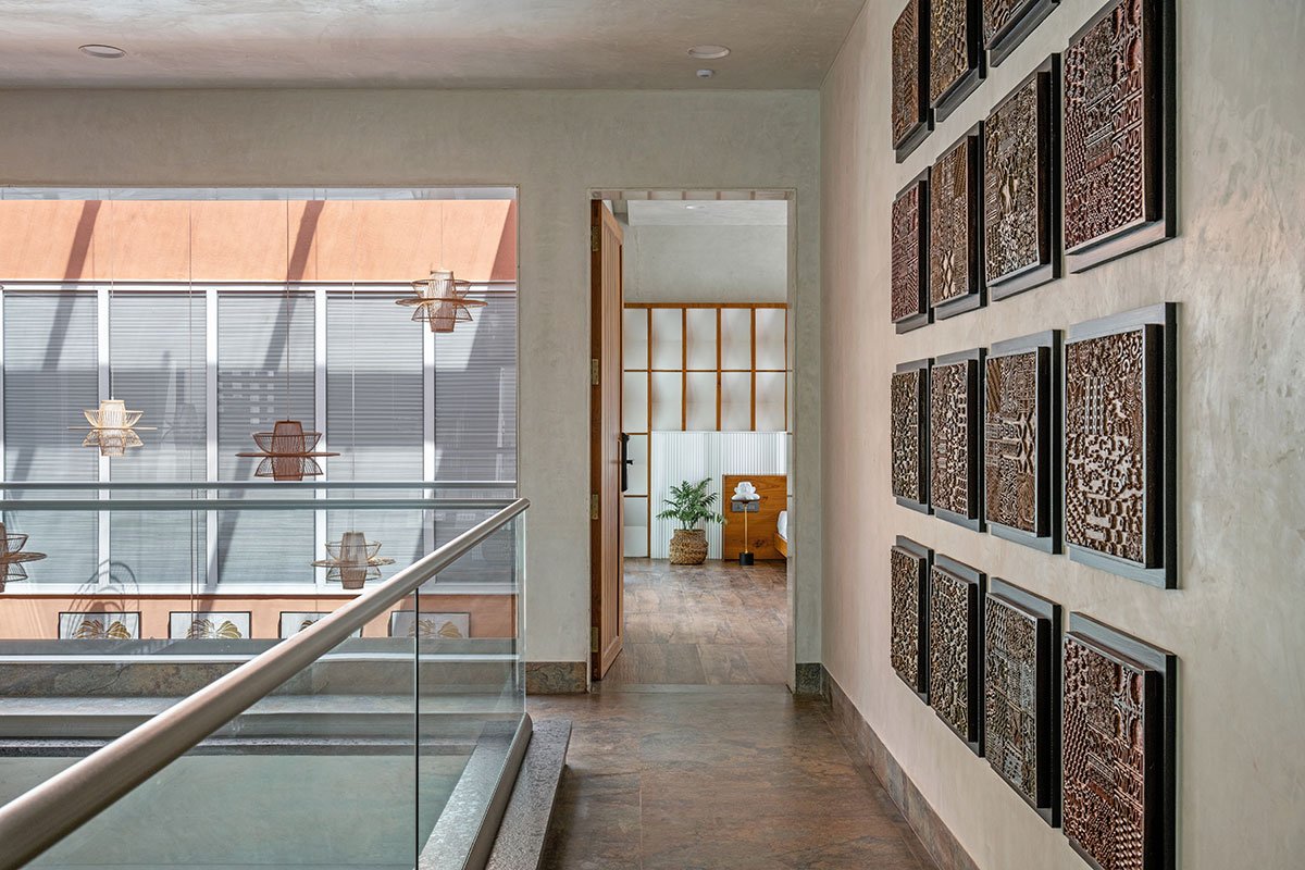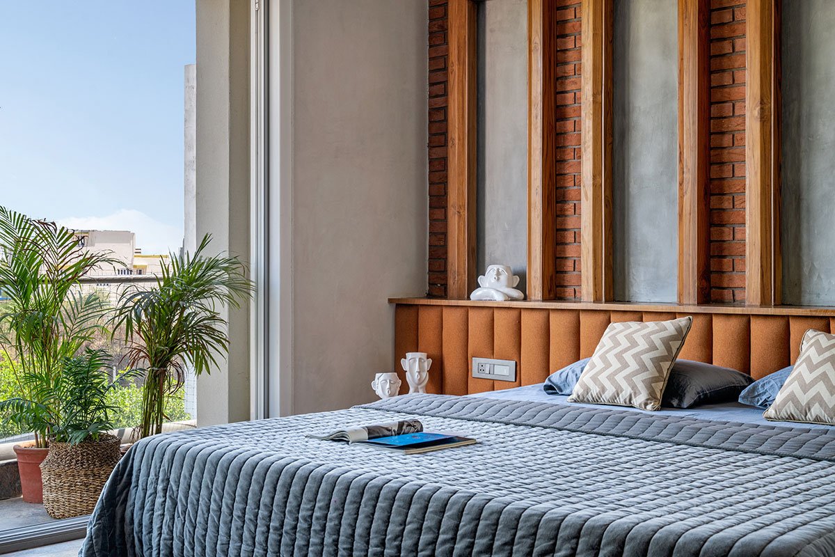 A standout feature in this bungalow is the staircase. The stairs are cantilevered from a robust RCC brick wall, showcasing a seamless blend of strength and elegance. Adding to its allure, the staircase boasts a one-of-a-kind V-shaped railing, elevating its aesthetic appeal to new heights. An artefact thoughtfully placed along the railing enhances the staircase’s beauty, serving as a focal point that complements the overall design.