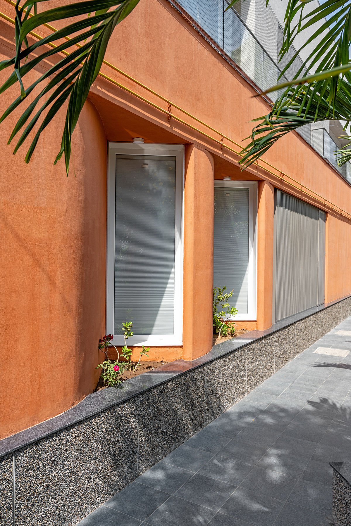 The compound wall integrates with the bungalow’s design, merging it as an integral element of the architectural vision. As one progresses, a subtle yet purposeful transition unfolds, with the height of the compound wall gradually rising, which serves to enhance the aesthetics. Moreover, the plants on either side add to the beauty; creating a welcoming atmosphere. This curvilinear wall leads to an inviting foyer.