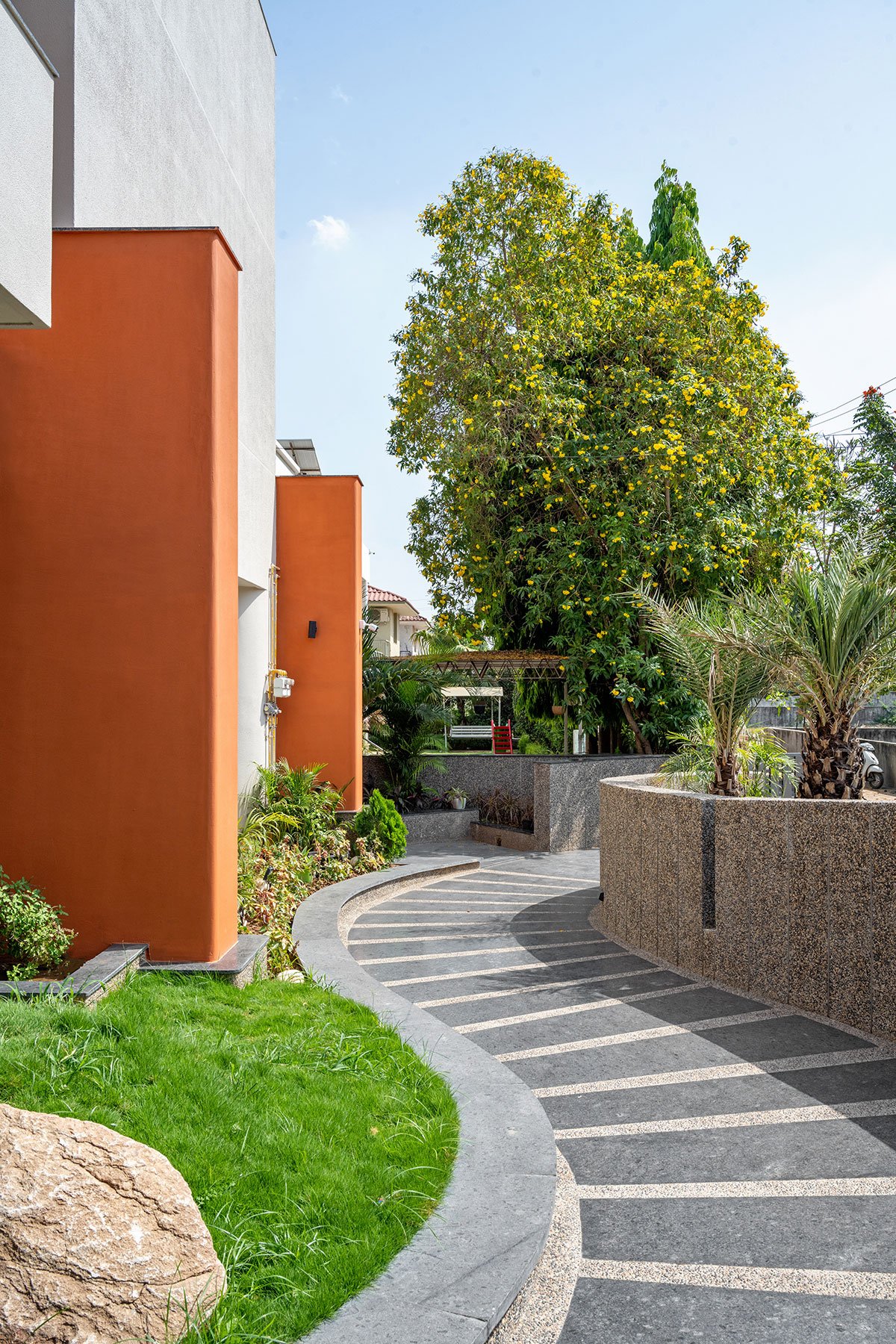 The periphery of the bungalow is surrounded by lush green plantations. This greenery smoothly integrates with the surrounding spaces, creating a picturesque view visible from every corner inside. Moreover, this thoughtful landscaping design greatly enhances the connection between the indoor and outdoor areas, offering a delightful living experience immersed in the tranquillity of nature.