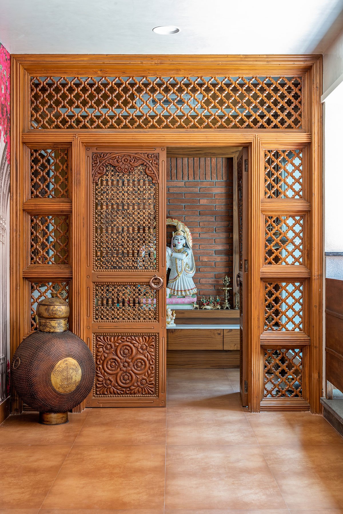 As per the client’s requirement, the pooja room was designed in a separate and isolated area. The architects ensured that the Puja room stood out as its own peaceful and distinct space. Providing a serene and sacred ambience, it allows for spiritual reflection, away from the hustle and bustle of daily activities in the rest of the house.