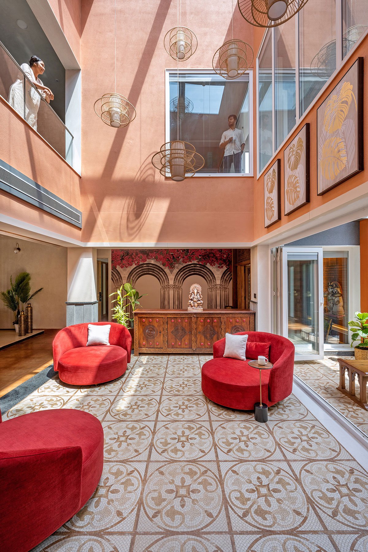 Colour Combination: Talking about colour combination, an exquisite blend of earthy palettes takes centre stage, featuring a combination of grey and orange tones. Mirroring the serene beauty of the natural world, these colours infuse the interior with a sense of calmness and warmth. The subdued greys create a pleasant backdrop, allowing the lively oranges to radiate energy and enthusiasm. Terracotta shade is used for flooring tiles. This thoughtfully curated colour selection not only establishes a profound connection with nature but also envelops the entire space in a welcoming and cosy ambience.
