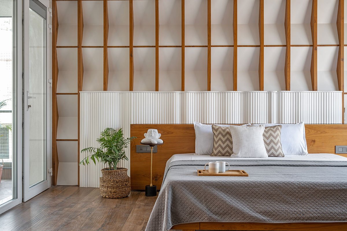 Children Bedroom: The bed’s backdrop features a wavy design, crafted from a unique blend of two materials: sleek veneer and textured fluted MDF. This combination creates a contrast that adds both depth and visual interest to the bedroom space. Also, the presence of a white colour bestows a tranquil aura upon the room.