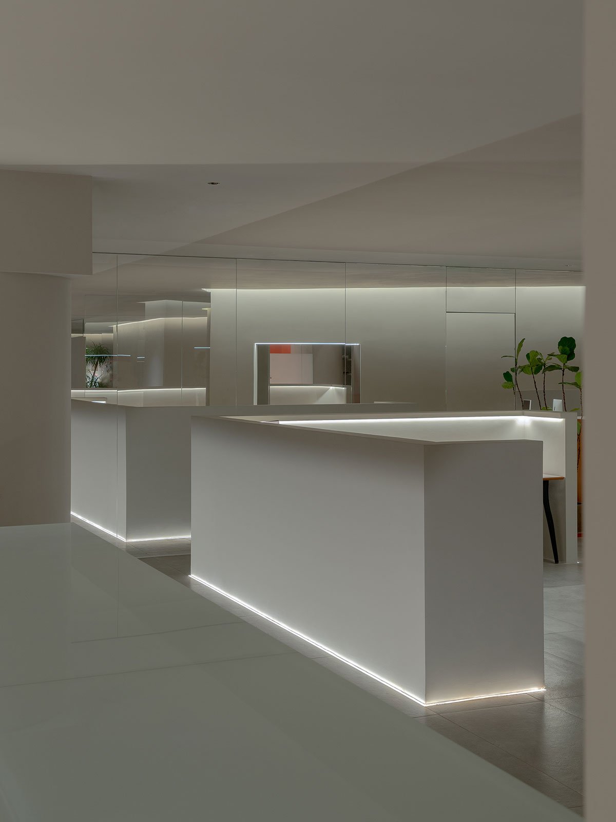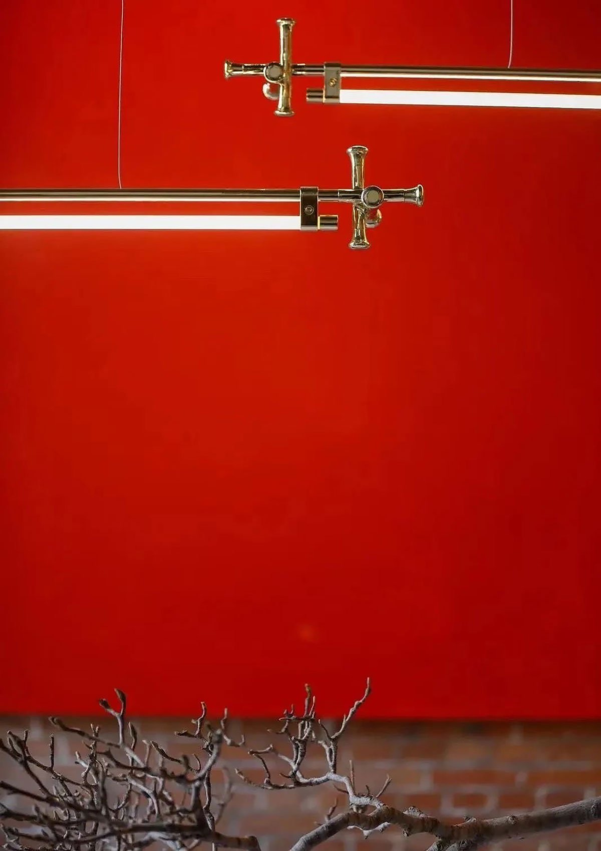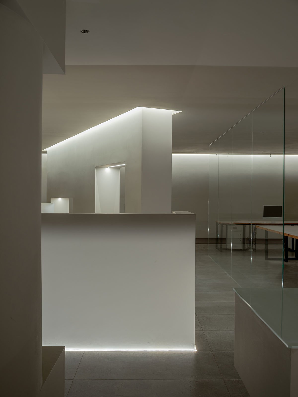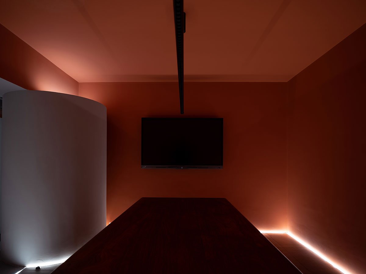 The initial seriousness is broken by the “peek” and “niche” between transmitting and receiving above the entry screen wall. The design’s unintentionally disclosed “niche” is ready to be recognized. The switch for altering the ambiance in the workplace area is also by the lighting. The Forbidden City’s orange lights shine on the gray brick floor as office workers leave during the day, giving the area a distinctive Eastern look and shadows.