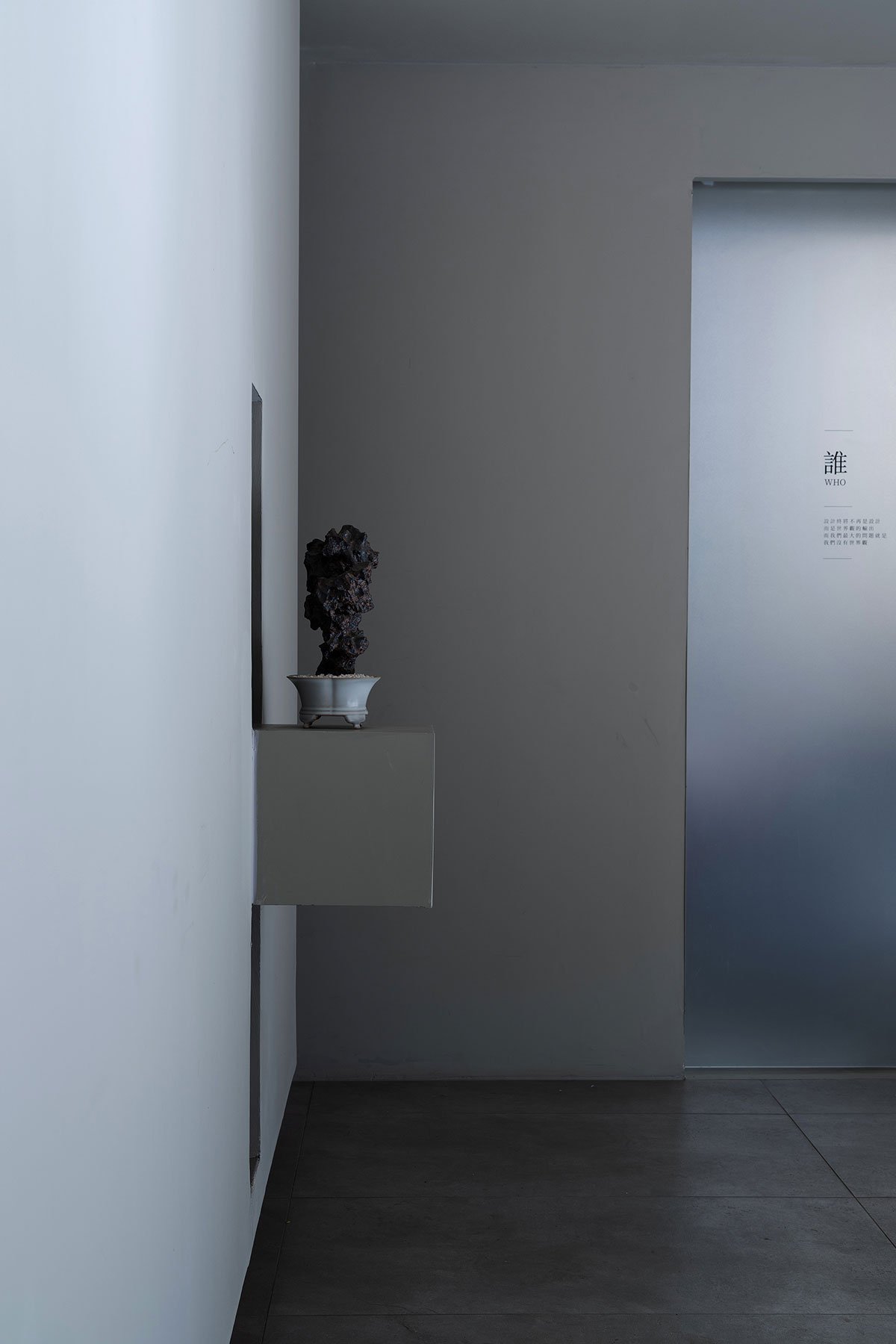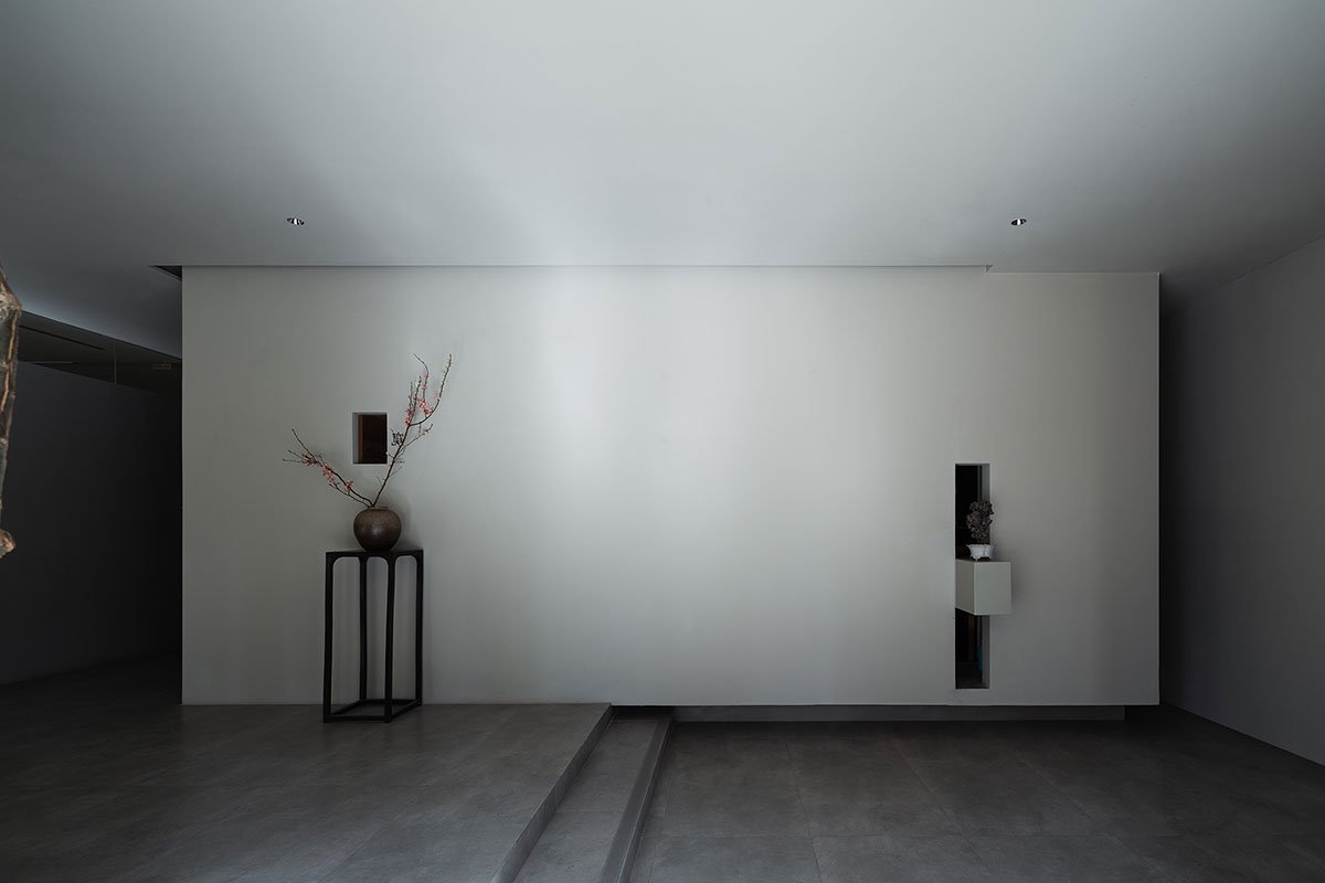 These two spaces have independent pathways but are connected through a corridor, resembling the front and backyard of an authentic Chinese courtyard. Shui Yuan serves as the aesthetic space for Shui Zui Zhong Guo. Instead of the typical all-white tone seen in art galleries, it returns the space to its most primitive state by stripping the original wall plaster.