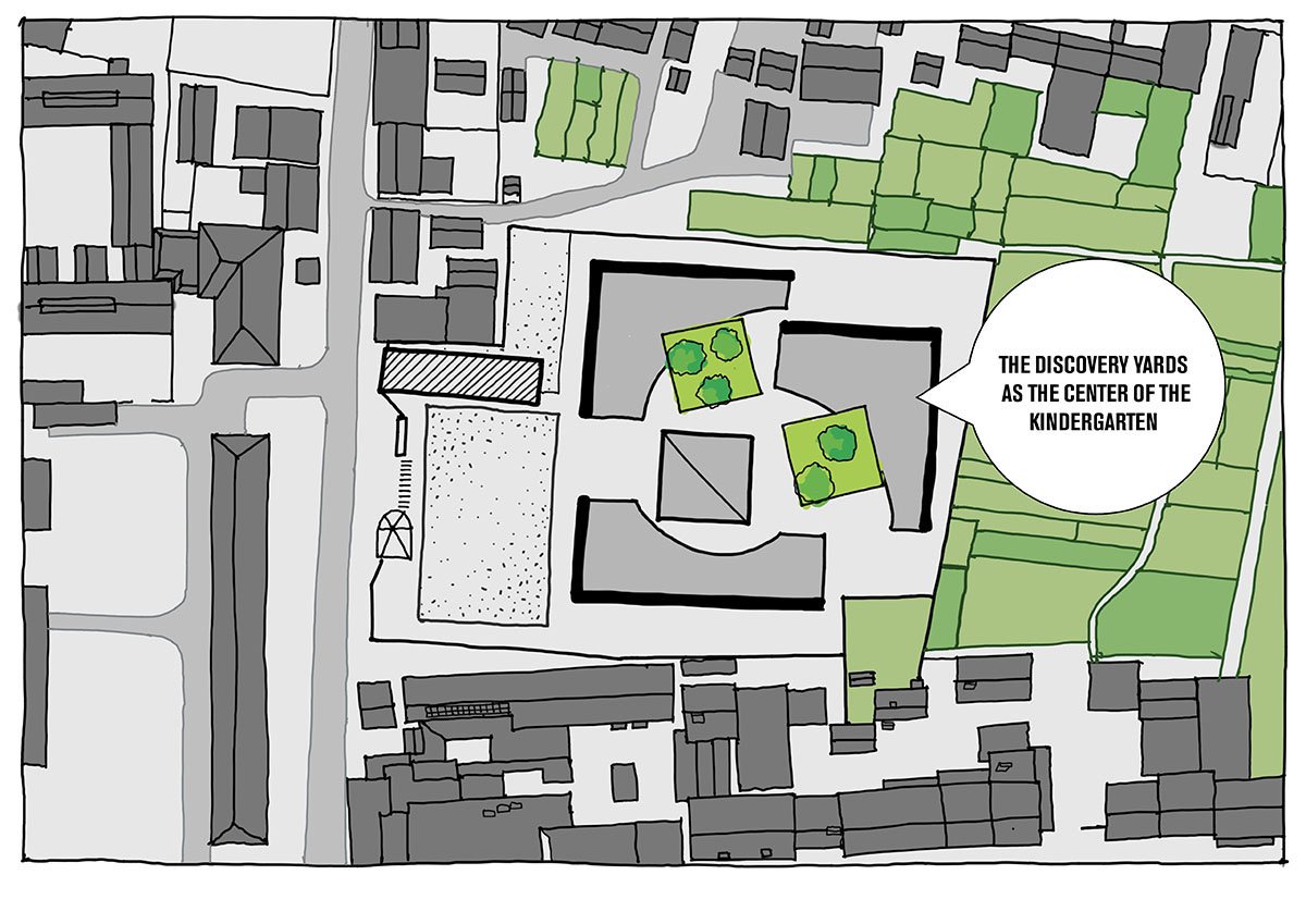 The complexity of this inner courtyard arrangement attracts and motivates children to explore the surroundings with their natural curiosity and it encourages them to create games, help them feel intimate and connected with people and ease their loneliness, in a micro village modeling the real world beyond. Accumulating social skills, and exercising their spatial logic and sense of orientation, it supports the development of skills needed to navigate environments and social engagement in future life.