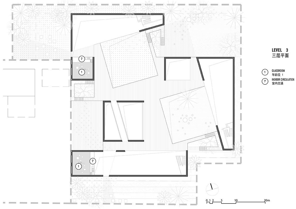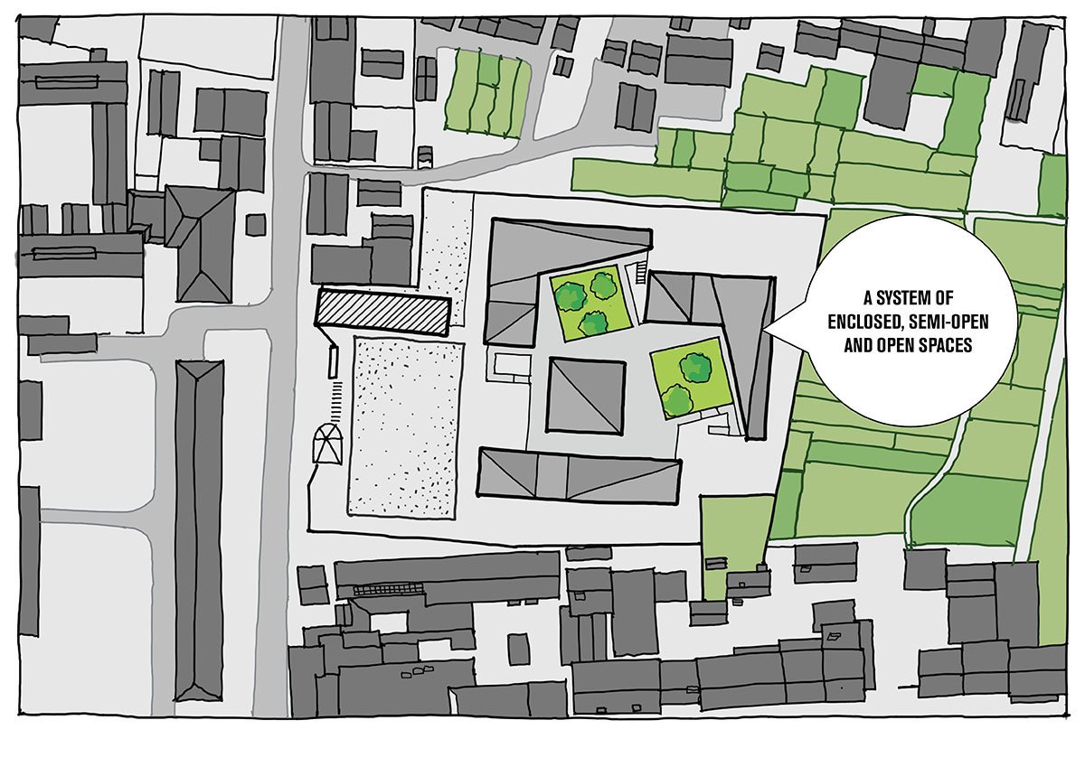 Shuoji kindergarten is located within the core of the thriving county town, densely occupied by commercial businesses, institutions, production facilities and characterized by drive through traffic. Acknowledging this compact surrounding, Crossboundaries designed a group of independent multi-story buildings, which create a relatively enclosed and protected space in the center for children to play and learn. The architectural form imitates the local village dwellings around it and at the same time stands out with its simplified volumes. The buildings façades consist of two main materials, the locally produced grey bricks on surfaces oriented towards the center of the site and its inner courtyards in combination with contrasting white plaster, to the outer sides. The geometric white planes stand out in the chaotic village and make the buildings identifiable in the environment and easily recognizable for all the community. Different window sizes and heights form a rich and transparent inside and outside relationship and filter in bountiful natural lighting.