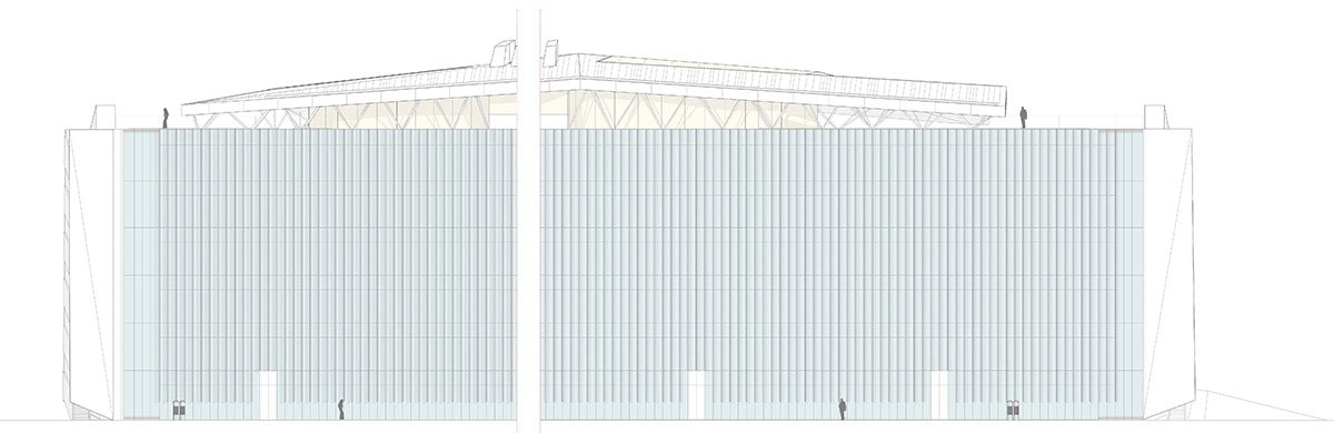 The Sidera building extends horizontally for a length of 100 metres and has a height of 33 metres, starting from a soil plinth that is approximately 3 metres high. The external surface features only three materials: aluminium (six kilometres of vertical fins), black pigmented concrete and glass (about 5000 square metres of glazing on the façade).