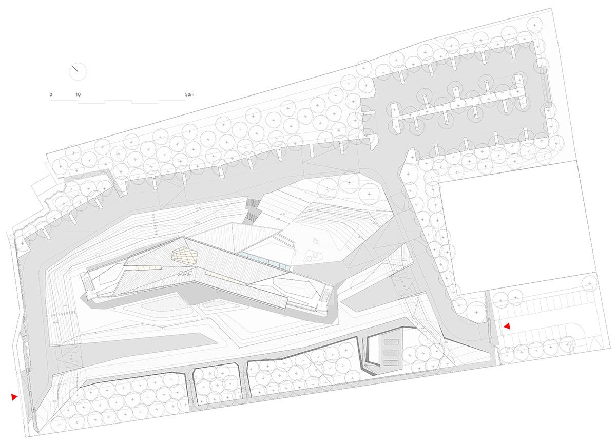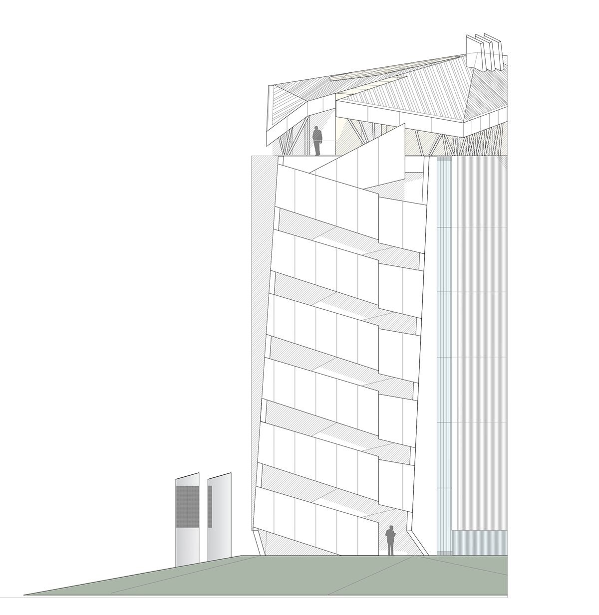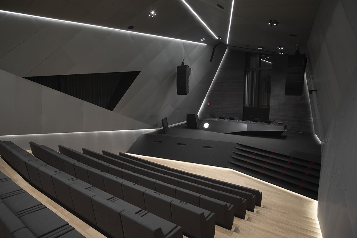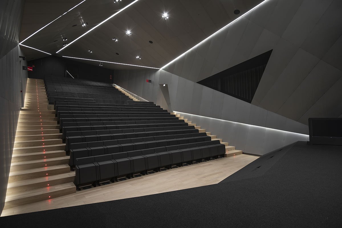 People themselves thus become a component part of the project, the key required to activate a machine that is full of cogs and gears; and when the machine is allowed to run, it generates a stimulating narrative, full of surprises, constantly searching for reactions.The Sidera building is a living, creative organism that denies the rigid logic of orthogonality and avoids all static constraints or obligations to monumental and banal symmetry. The entrance, the circulation spaces, the assembly hall and the top floor are all arranged in an interplay of alternating spatial compressions between the walls and ceilings and the sloping and faceted surfaces.