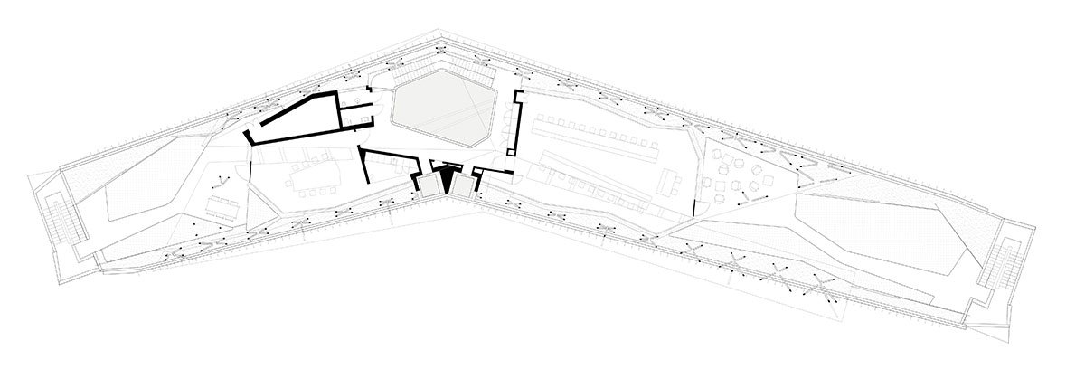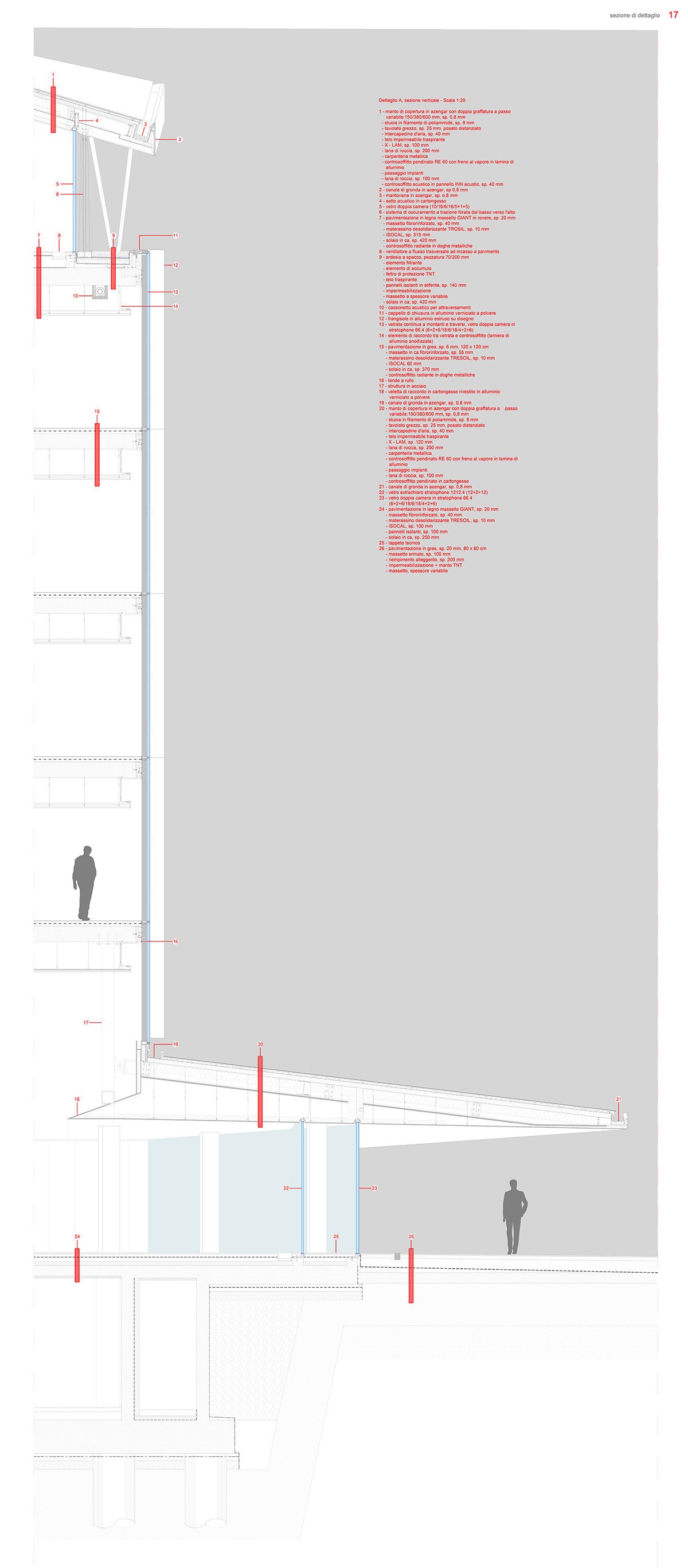 The concept of the envelope of the building does not refer only to the exterior façades, but also includes the roof, which was immediately interpreted as a kind of fifth elevation, since we are aware of the fact that with the rise of contemporary navigation tools, such as Google Earth, we are now all accustomed to looking at and perceiving spaces from above. This awareness translates into the need to also include defining architectural features for this viewpoint. The vernacular motif of the pitched roof was selected for this purpose, which, in itself, is unprecedented in such an industrial context. Six sloping pitches are scattered across the space exploiting the three large skylights as connection points, in the quest to create a dialogue with the skyline of the nearby Apennines.