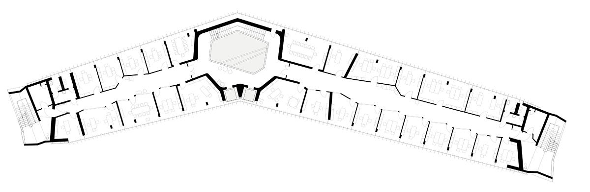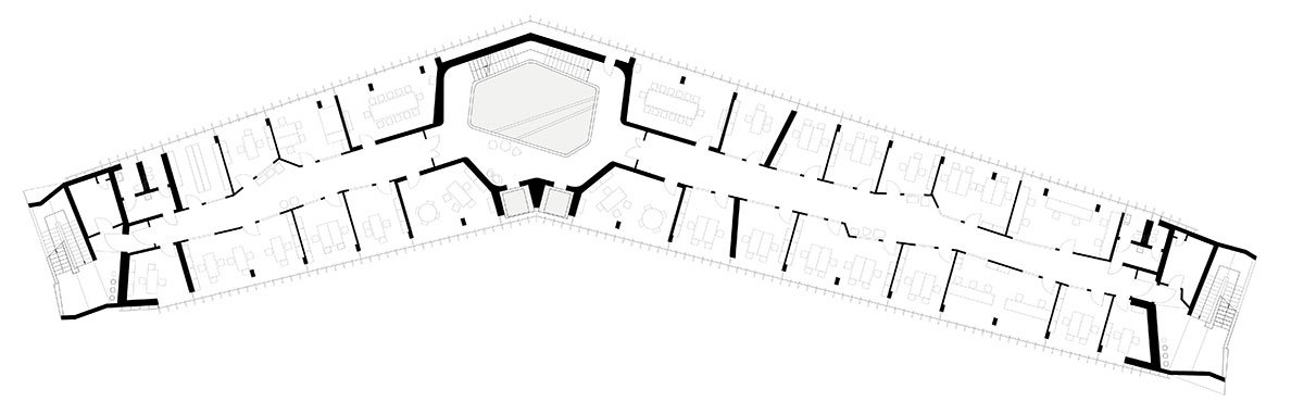 1- The building had to ensure maximum flexibility in the configuration of office spaces while avoiding an open-plan formula and guaranteeing exclusive work spaces for 1 or 2 people;