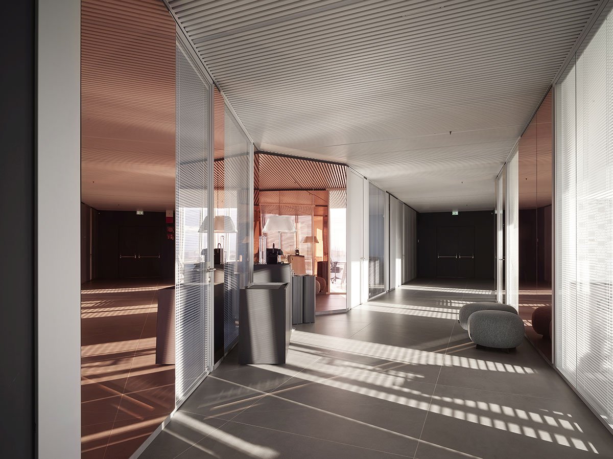 The glass skin covering the Sidera building controls the inflow of natural light that floods every workspace; the light fixtures follow the 24-hour circadian rhythm; the technology employed for ventilation control and the total absence of operable windows ensure the indoor air is clean and healthy despite being in one of the most polluted areas in Europe; from every interior space and from any level it is possible to look out on the view of greenery outside.