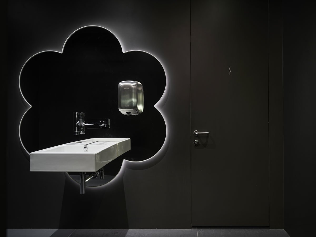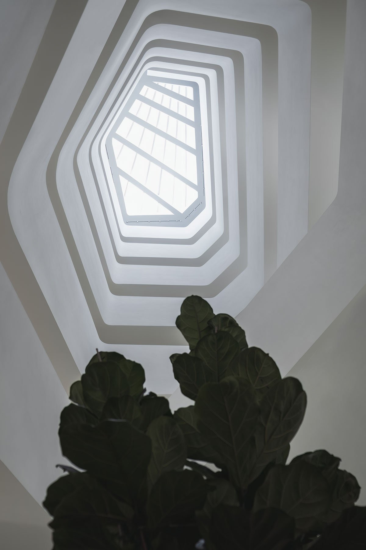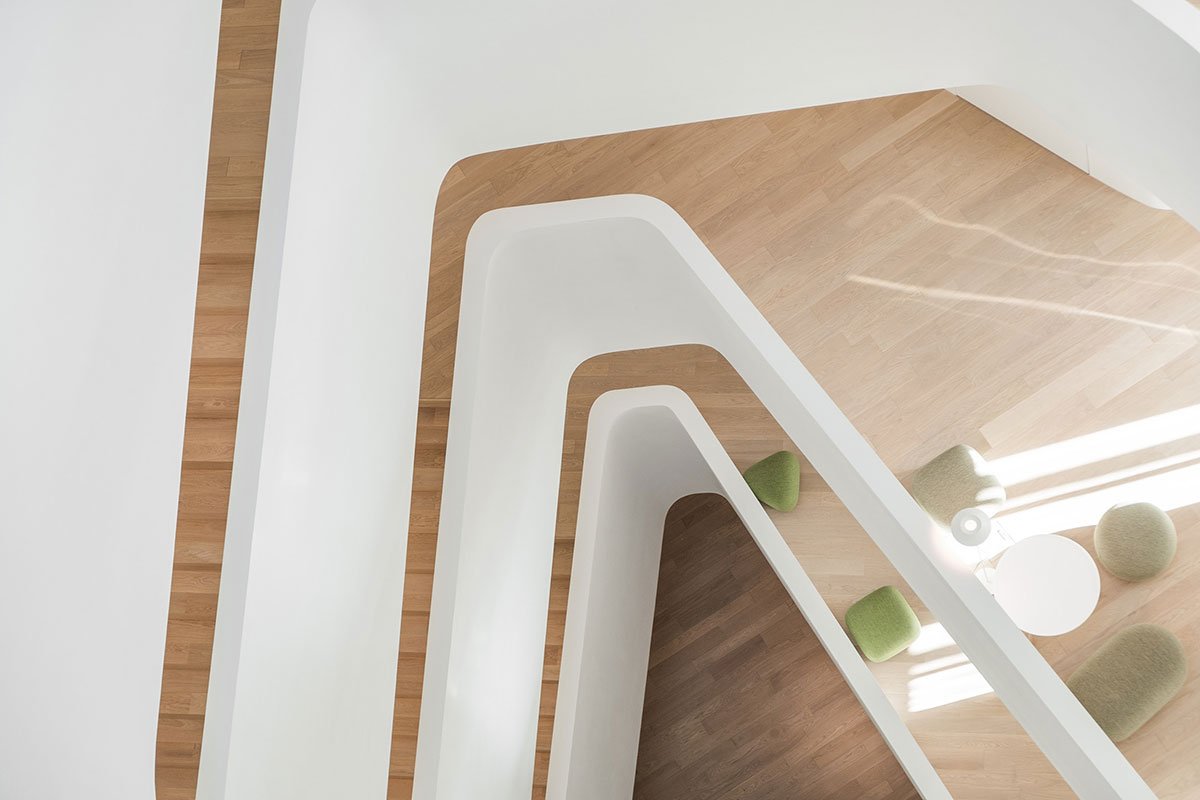 Between shard-like shapes and diagonal slashes, the large internal staircases act as an element of disruption for the entire layout, starting from the fact that it is the only space from which the full internal height of the Sidera building can be enjoyed in all its glory. The hypertrophic and sinuous lines play with contrast, drawing the visitor towards itself like a disruptive centripetal force. The ribbon created by the parapet of the staircase worms and winds its way upward, like a living organism whose branches are attracted by the sunlight that penetrates through the large skylight.