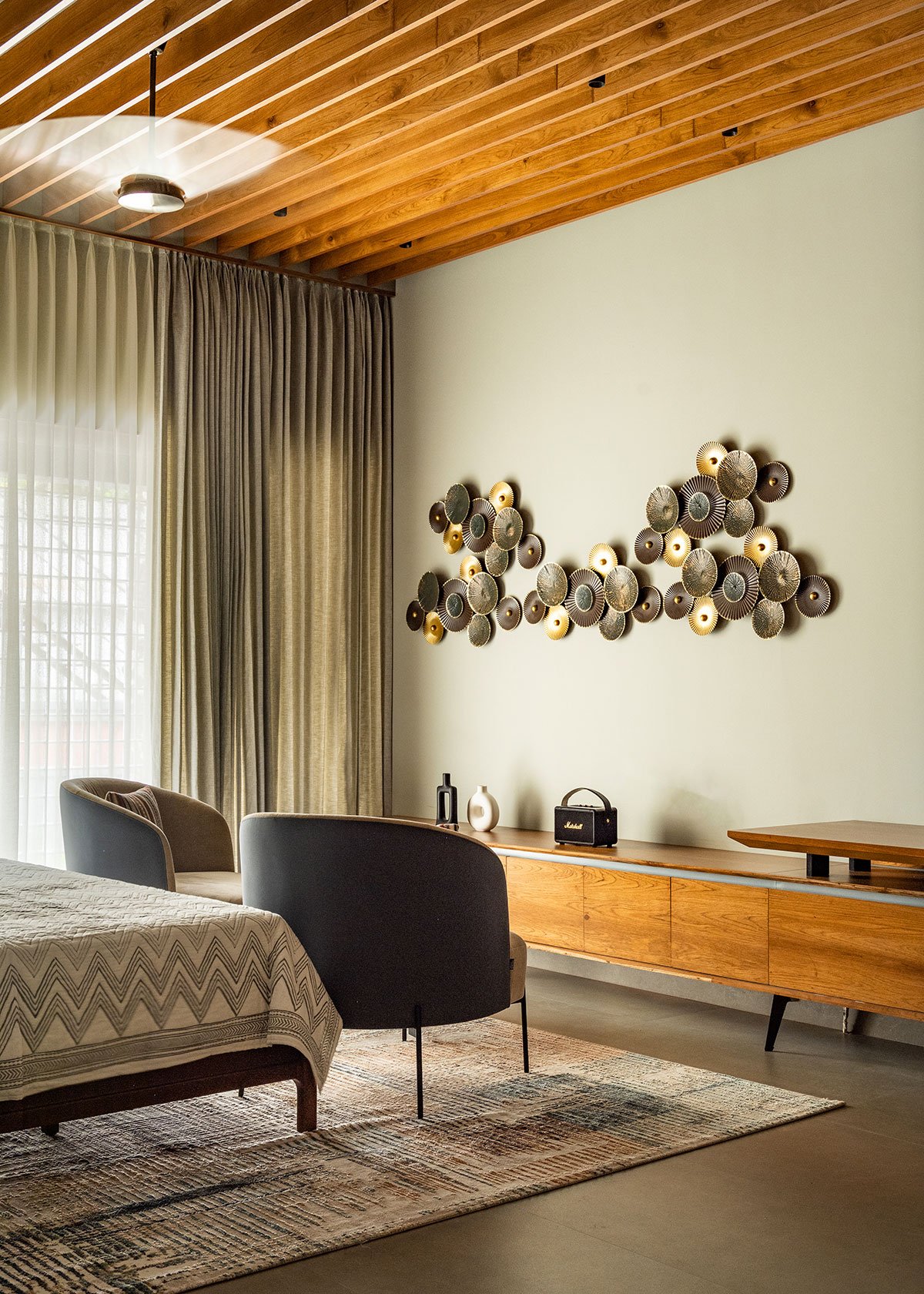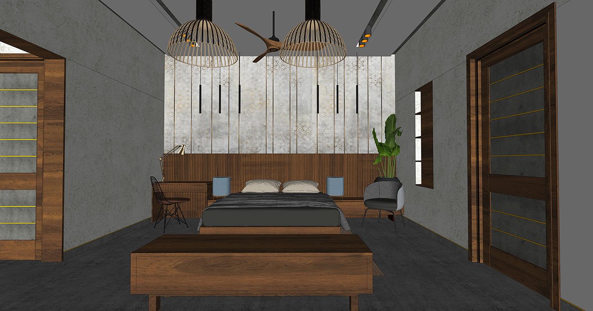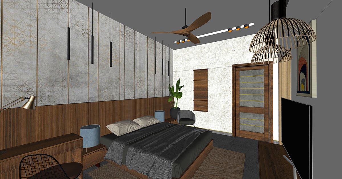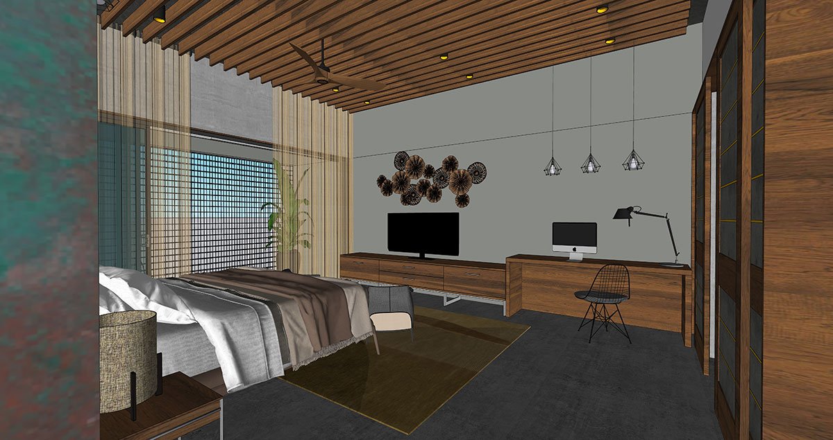 Flanking the first floor, as you ascend the stairs, is a theatrical balcony overlooking the palatial living. This floor features a second ladies living and three stunning bedrooms. Edging the stairs is a classic grey-panelled bedroom adorned in rattan and hazelnut finishes, which leads to an outdoor open terrace. Illustrated in textured stone tiles and fluted panels is a fourth bedroom that borders the northern province. An open terraced garden court, shaded by a tree with a ‘thinnai’ (bench) around it, sits atop the car porch in magnificent poise. The primary bedroom on this floor, in shades of cool greys and wooden flutes, is nourished along with a personal trellis balcony.