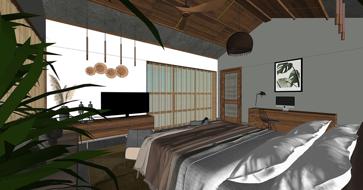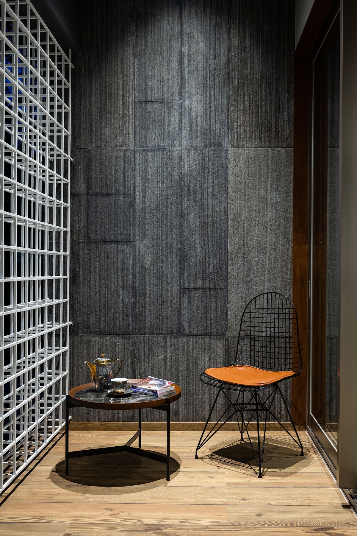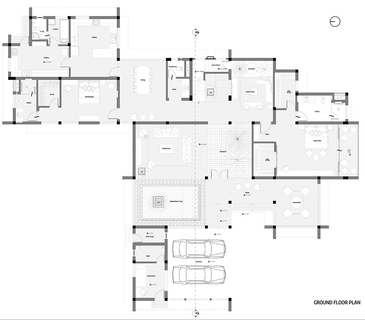Flanking the first floor, as you ascend the stairs, is a theatrical balcony overlooking the palatial living. This floor features a second ladies living and three stunning bedrooms. Edging the stairs is a classic grey-panelled bedroom adorned in rattan and hazelnut finishes, which leads to an outdoor open terrace. Illustrated in textured stone tiles and fluted panels is a fourth bedroom that borders the northern province. An open terraced garden court, shaded by a tree with a ‘thinnai’ (bench) around it, sits atop the car porch in magnificent poise. The primary bedroom on this floor, in shades of cool greys and wooden flutes, is nourished along with a personal trellis balcony.